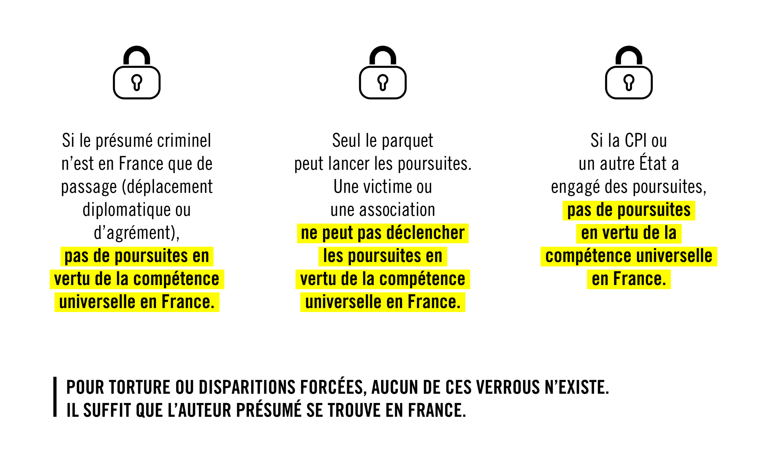 En France, l’exercice de la compétence universelle est soumis à quatre régimes qui diffèrent selon le crime poursuivi (crime de torture, crime contre l’humanité, etc.). Ces différents régimes d’application de la compétence universelle rendent le processus illisible et inégal.