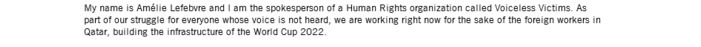 « Amélie » proposait à Amnesty de collaborer avec Voiceless Victims, ou VLV. Elle était manifestement animée d’une grande conviction sur ce sujet : « [Le gouvernement qatari], au nom de son goût pour l’ostentation, piétine quotidiennement les droits fondamentaux de centaines de milliers de travailleurs étrangers qui construisent, entre autres, les stades destinés à la Coupe du monde. »