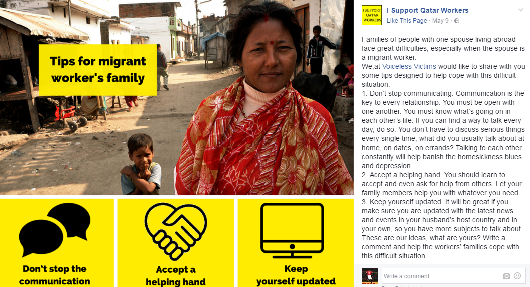 « Nous avons essayé avec nos moyens limités de sensibiliser l’opinion publique et de dévoiler les graves violations de leurs droits humains que subissent les travailleurs étrangers au Qatar. Malheureusement, depuis que nous avons lancé cette campagne, nous avons reçu de nombreuses menaces. Nous espérons sincèrement que les informations dont vous disposez n’émanent pas des mêmes personnes, celles qui font tout pour nous détruire et pour empêcher que la vérité sur la situation des travailleurs étrangers au Qatar soit révélée au grand jour. »