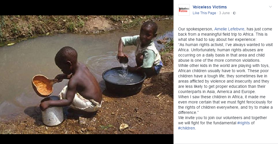 L’absurdité de l’imprécision de cette référence à un voyage « en Afrique », la description stéréotypée des enfants africains et l’absence de substance dans cette publication suggèrent qu’elle ne servait à rien d’autre qu’à convaincre que VLV était une vraie organisation qui travaillait sur plusieurs sujets liés aux droits humains.