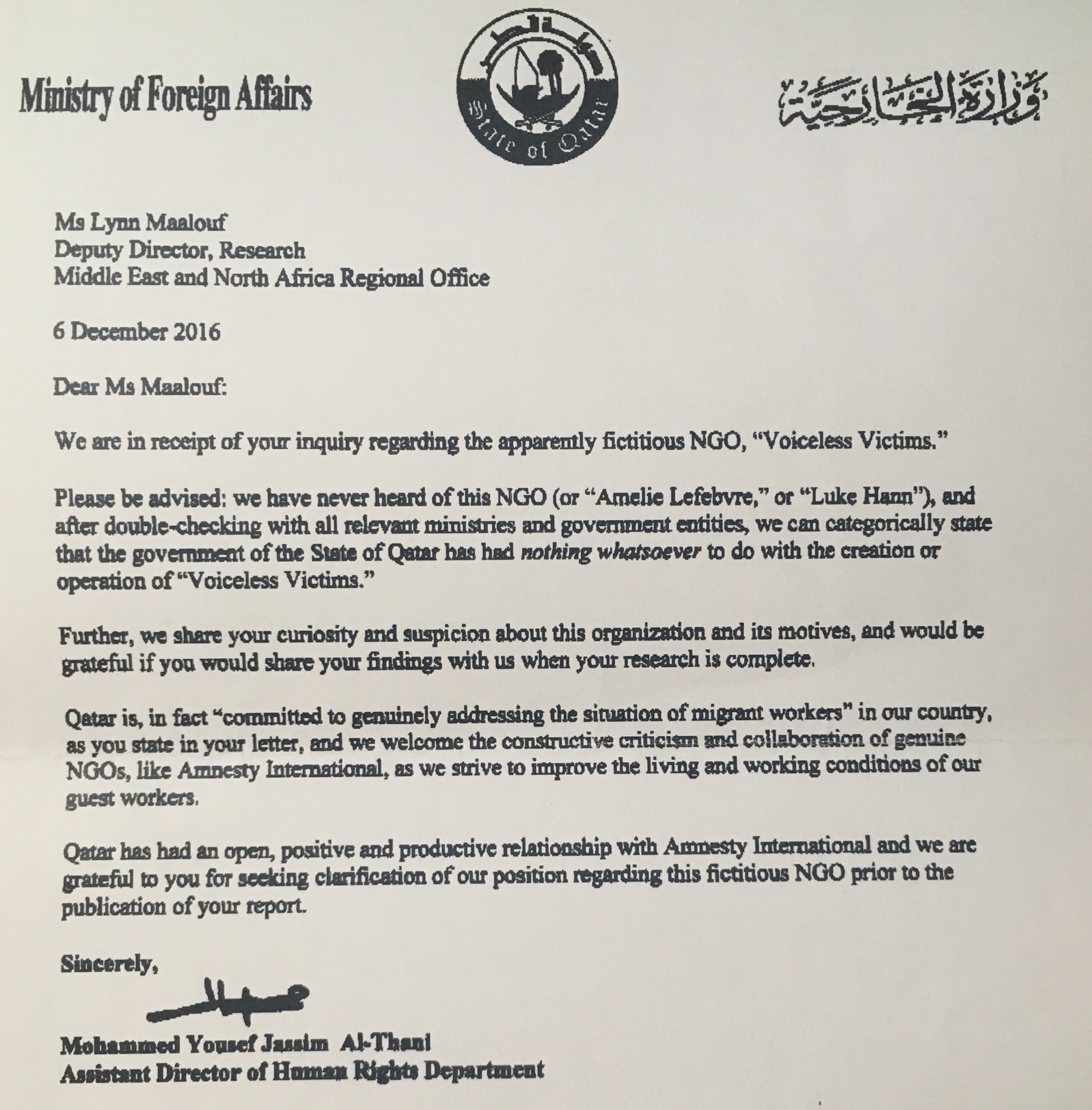 Après avoir vérifié auprès des ministères et agences du gouvernement concernés, nous pouvons affirmer catégoriquement que le gouvernement de l'État du Qatar n'a rien eu à voir avec la création de l'opération de « Voiceless Victims ». »