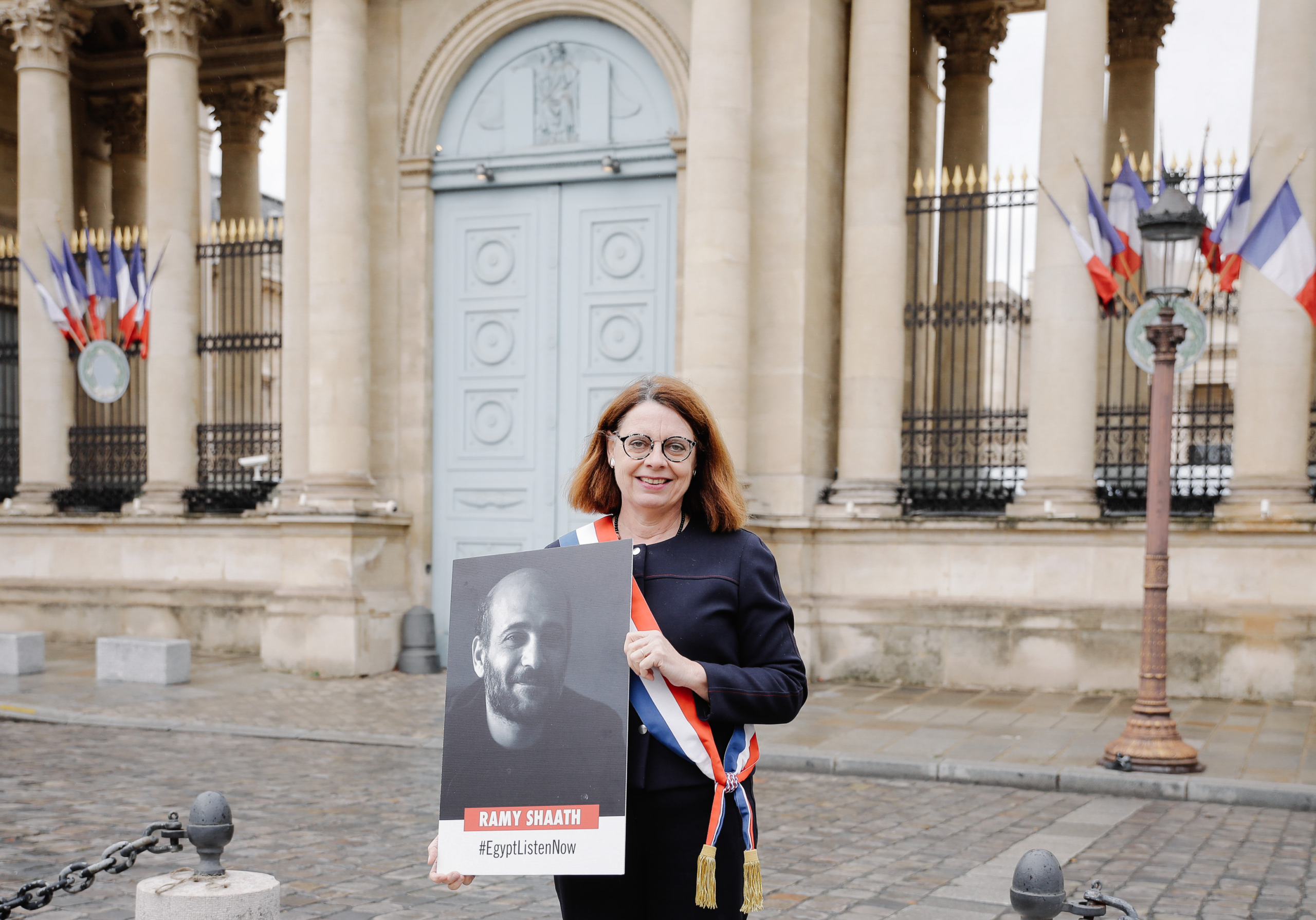 La députée Mireille Clapot avec le portrait de Ramy Shaath, défenseur des droits humains, devant l’Assemblée nationale © Christophe Meireis