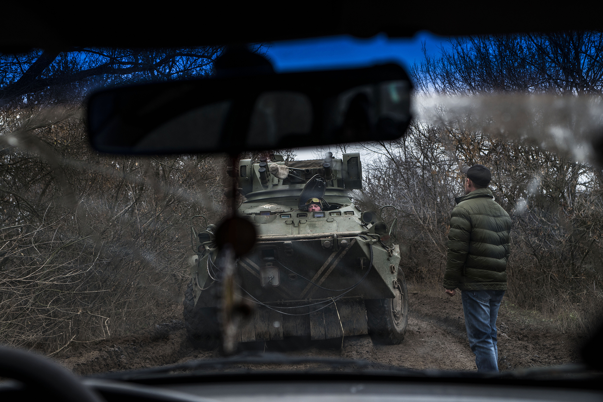 Un tank sur le chemin difficilement praticable d’un village en Ukraine © Marion Péhée