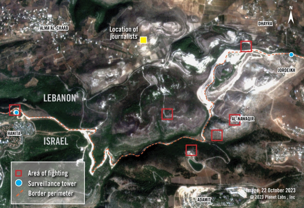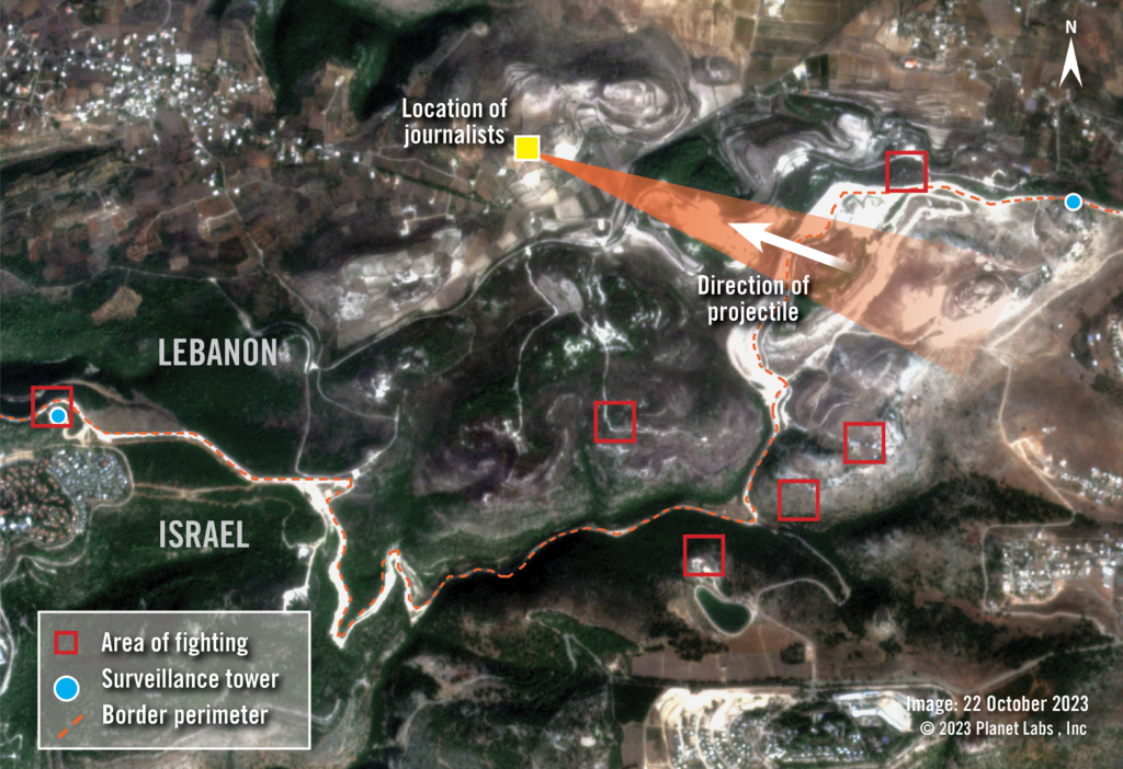 Aperçu de la zone montrant le périmètre de la frontière, les tours de surveillance et les zones de combat filmés par les journalistes avant qu’ils ne soient frappés. La direction du projectile et la zone depuis laquelle il a été envoyé sont également affichés.