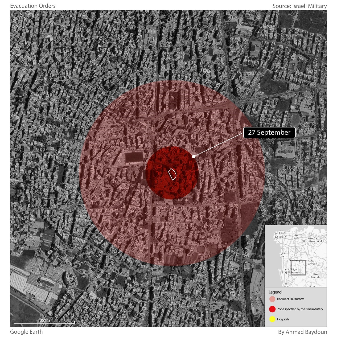 La carte accompagnant l’ordre d’évacuation dans le quartier d’Al Laylaki indiquait une zone colorée en rouge, censée représenter le rayon de 500 mètres autour des bâtiments ciblés. Cependant, cette zone ne couvrait en réalité qu’un rayon d’environ 135 mètres. Sur les 500 bâtiments situés dans ce rayon de 500 mètres, seulement 30 immeubles apparaissaient dans la zone rouge, et étaient donc prévenus qu’ils étaient concernés par l’ordre d’évacuation.