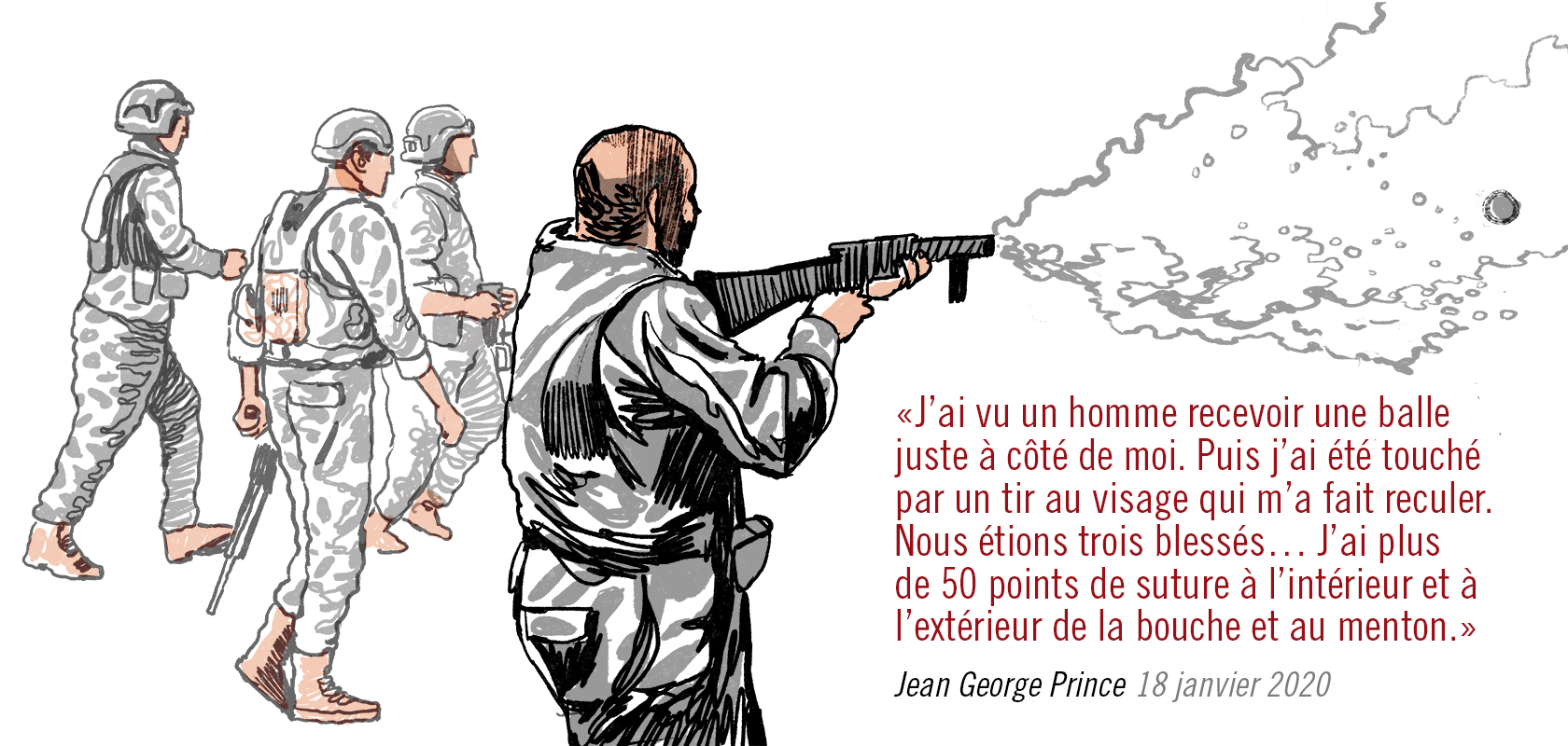 Un autre manifestant, Jean George Prince, a été blessé par une balle en caoutchouc, le 18 janvier. Il a raconté qu’il manifestait pacifiquement près de l’hôtel Le Gray lorsqu’il a reçu une balle en caoutchouc au visage, qui lui a fendu la lèvre inférieure, au point de nécessiter de la chirurgie réparatrice.