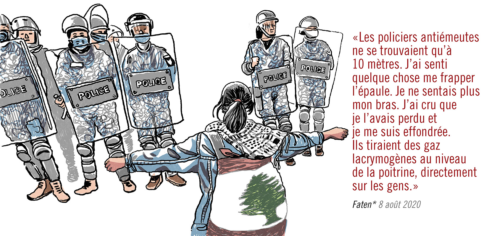 Dans bien des cas, le recours au gaz lacrymogène avait clairement pour but de disperser une manifestation largement pacifique, ce qui viole le droit à la liberté de réunion pacifique. Dans d’autres cas, nous avons obtenu des images montrant les forces de sécurité lancer des grenades lacrymogènes directement sur les manifestants. Cette pratique illégale et très dangereuse a causé bon nombre de morts dans d’autres régions du monde. Au Liban, elle a provoqué de graves blessures à la tête et sur le haut du corps.