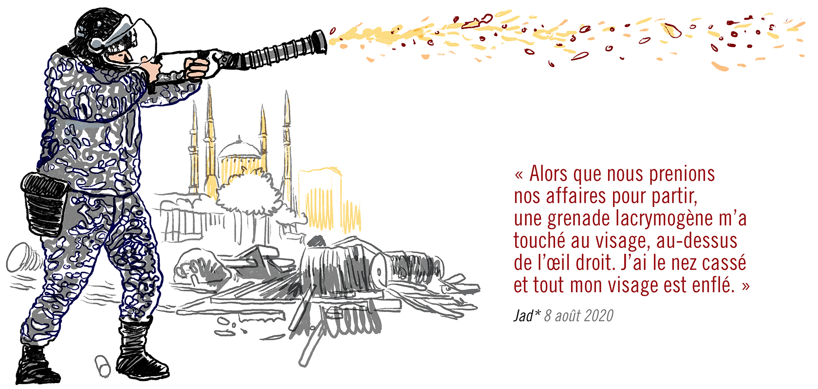 Tout au long de ces mois de contestation, les forces de sécurité libanaises ont eu recours de façon répétée à des moyens dangereux et illégaux pour tenter de contrôler les manifestations. Lors de la manifestation du 8 août, l’armée et les forces de sécurité libanaises ont réagi en tirant, y compris à balles réelles, sur des manifestants non armés. Dans plusieurs cas que nous avons documenté, la force a été employée alors qu’elle n’était pas nécessaire et non provoquée, dans le seul but de disperser une manifestation pacifique.