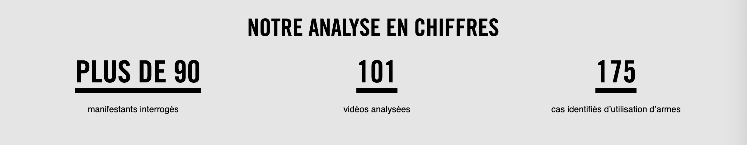 Nos différents services d’analyses ont collecté, vérifié et analysé 101 vidéos de manifestations entre 2015 et 2020, ce qui leur ont permis d’analyser et de classer les armes fabriquées en France et utilisées dans ces contextes. Nous étions également présents à Beyrouth pour surveiller les moyens employés par les forces de sécurité lors de manifestations, d’octobre 2019 à février 2020. Nous avons interrogé plus de 90 manifestants, victimes de blessures ou témoins, et examiné des rapports médicaux.