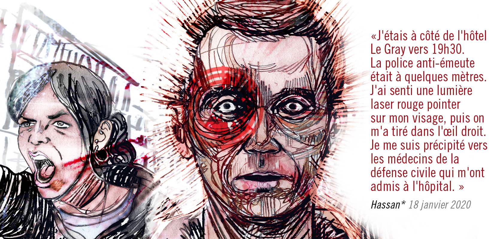 Selon les médecins, un autre manifestant, Hassan*, a été touché à l’œil par une balle en caoutchouc.