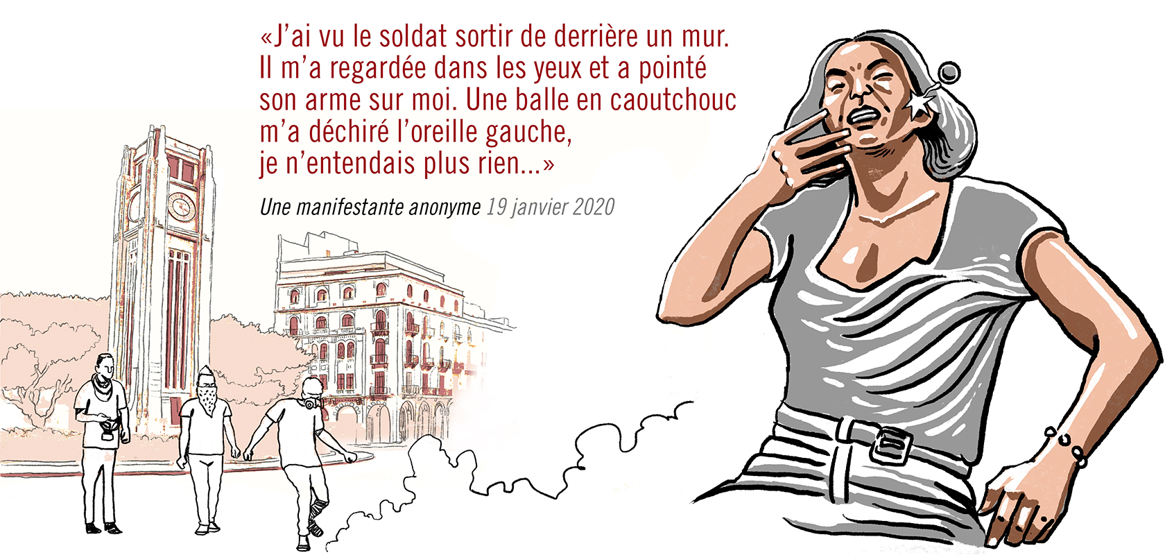 Nous avons également reçu le témoignage d’une manifestante qui a préféré garder l’anonymat et qui participait aux manifestations près de la place Nejmeh, le 19 janvier, lorsqu’elle a vu un policier antiémeutes la viser directement depuis une faible distance. Alors qu’elle tentait de fuir, une balle en caoutchouc l’a touchée à l’oreille.