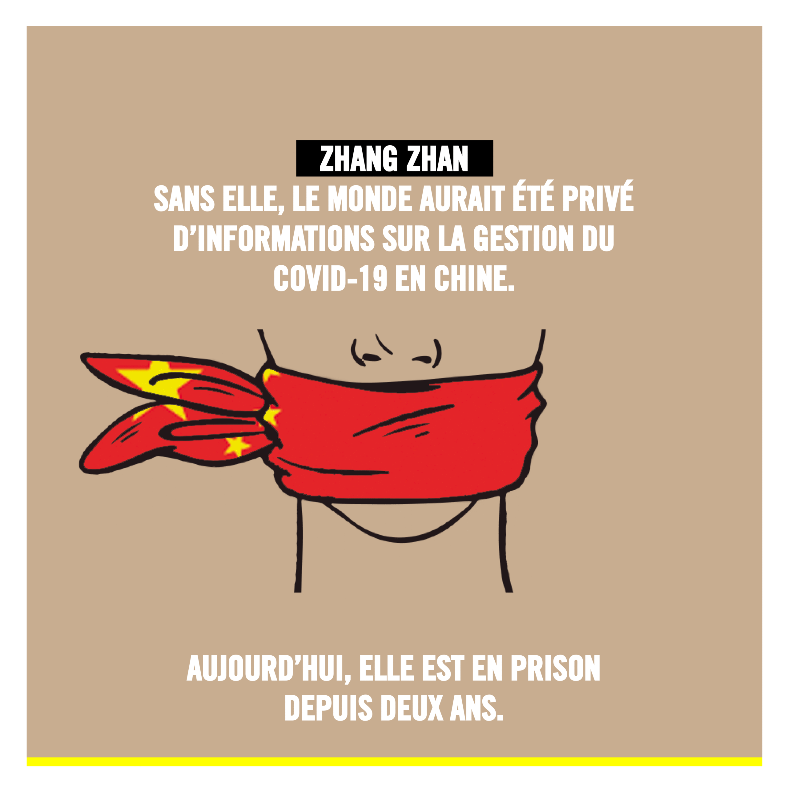 Zhang Zhan a tout risqué pour couvrir la pandémie de Covid-19 en Chine. Dans le cadre de son travail de journaliste citoyenne, Zhang Zhan a signalé sur les réseaux sociaux l’arrestation de journalistes indépendants et le harcèlement des familles de malades perpétrés par les autorités. C’est ce qui lui a valu une arrestation et une condamnation à quatre ans de prison.