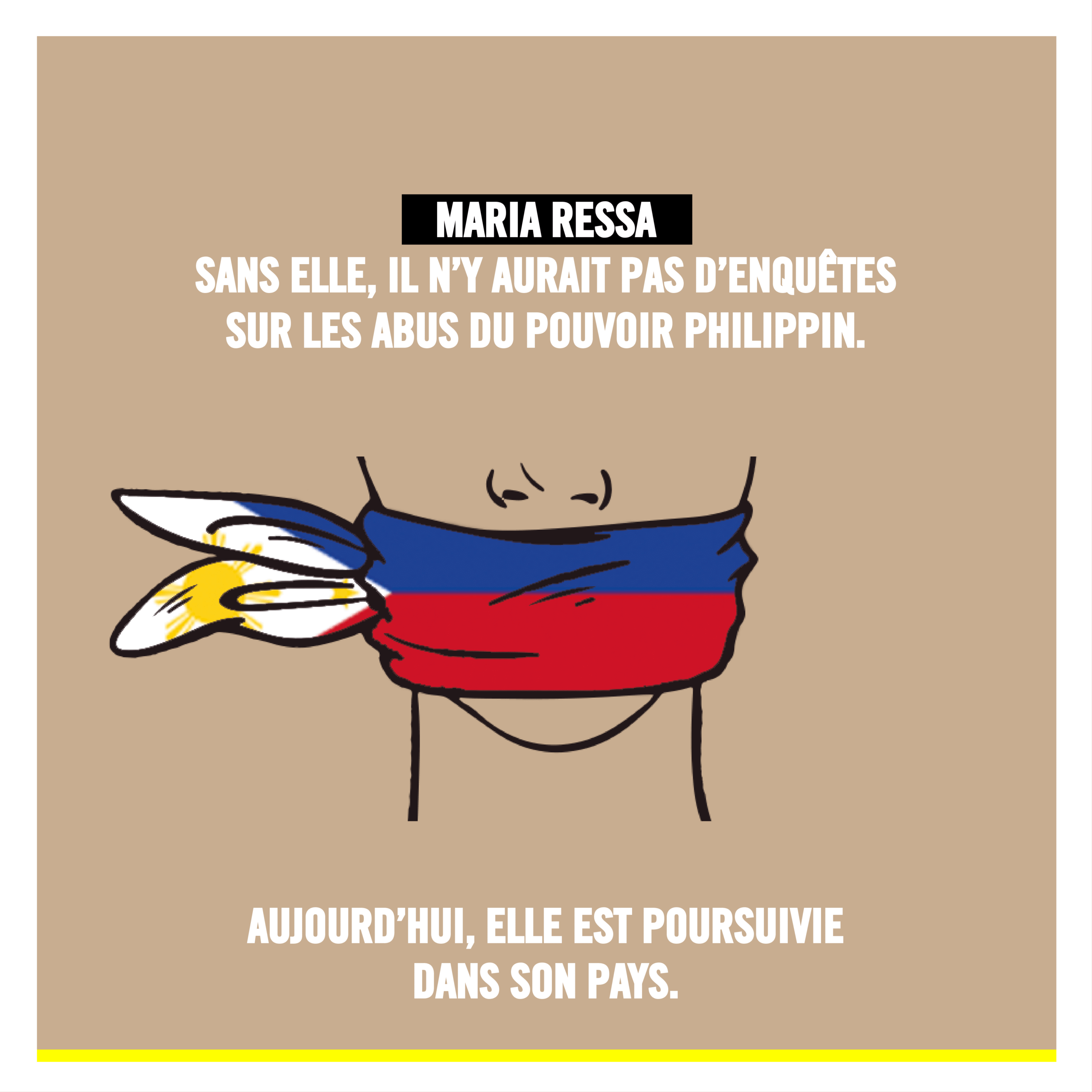 Cela fait plus de trente ans que Maria Ressa exerce son métier de journaliste aux Philippines. Elle publie des articles d’investigation sur la corruption, les abus de pouvoir, les violations des droits humains et l’impunité qui règnent dans son pays. Elle a subi des menaces et fait l’objet de poursuites dans son pays.