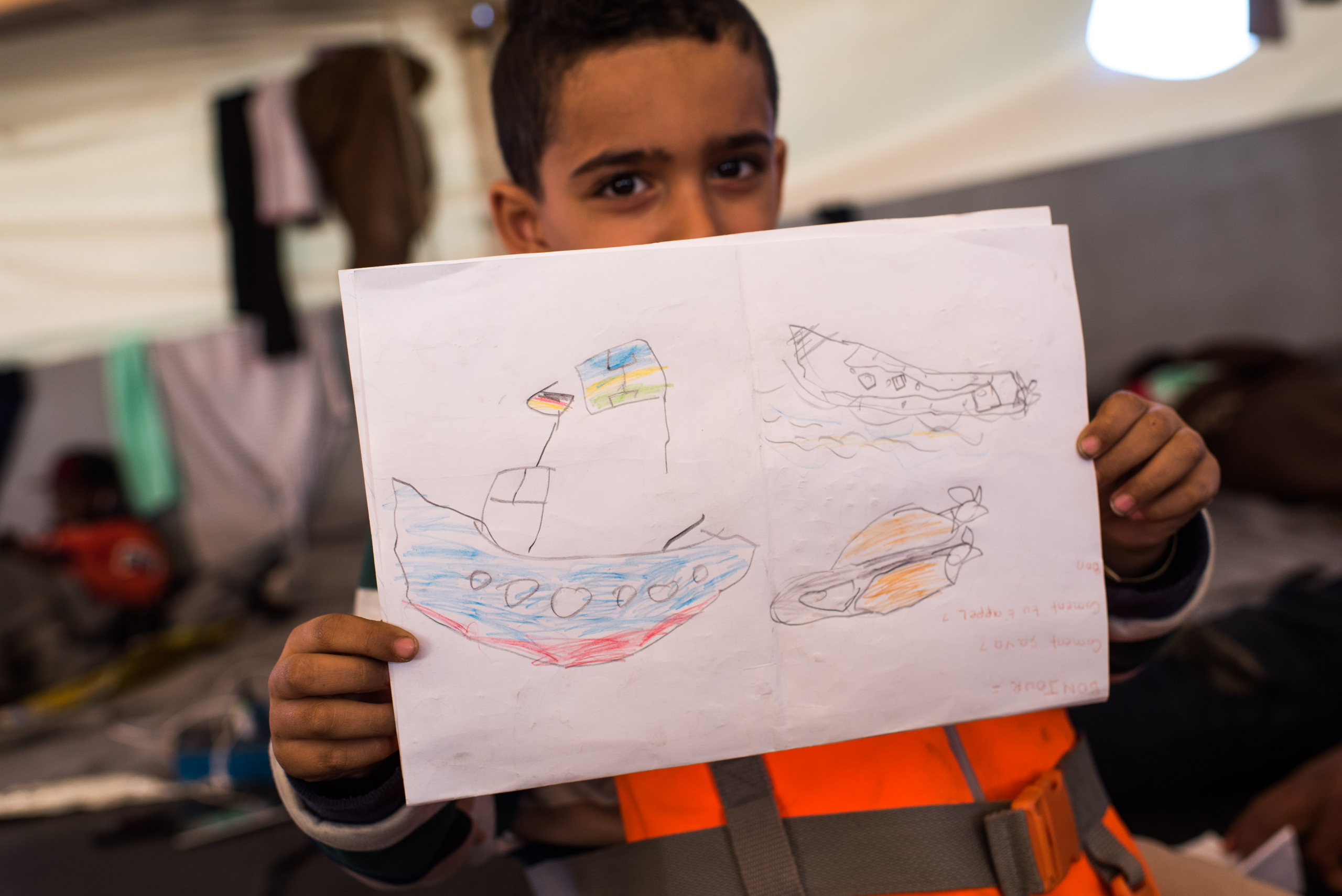 Veille de Noël à bord de Sea-Watch 3 : deux jours après avoir été secouru, Zizou présente un dessin sur le sauvetage. Le 22 décembre 2018, l’équipage du Sea-Watch 3 a sauvé trente-trois personnes de la détresse en mer. © Chris Grodotzki / Sea-Watch.org