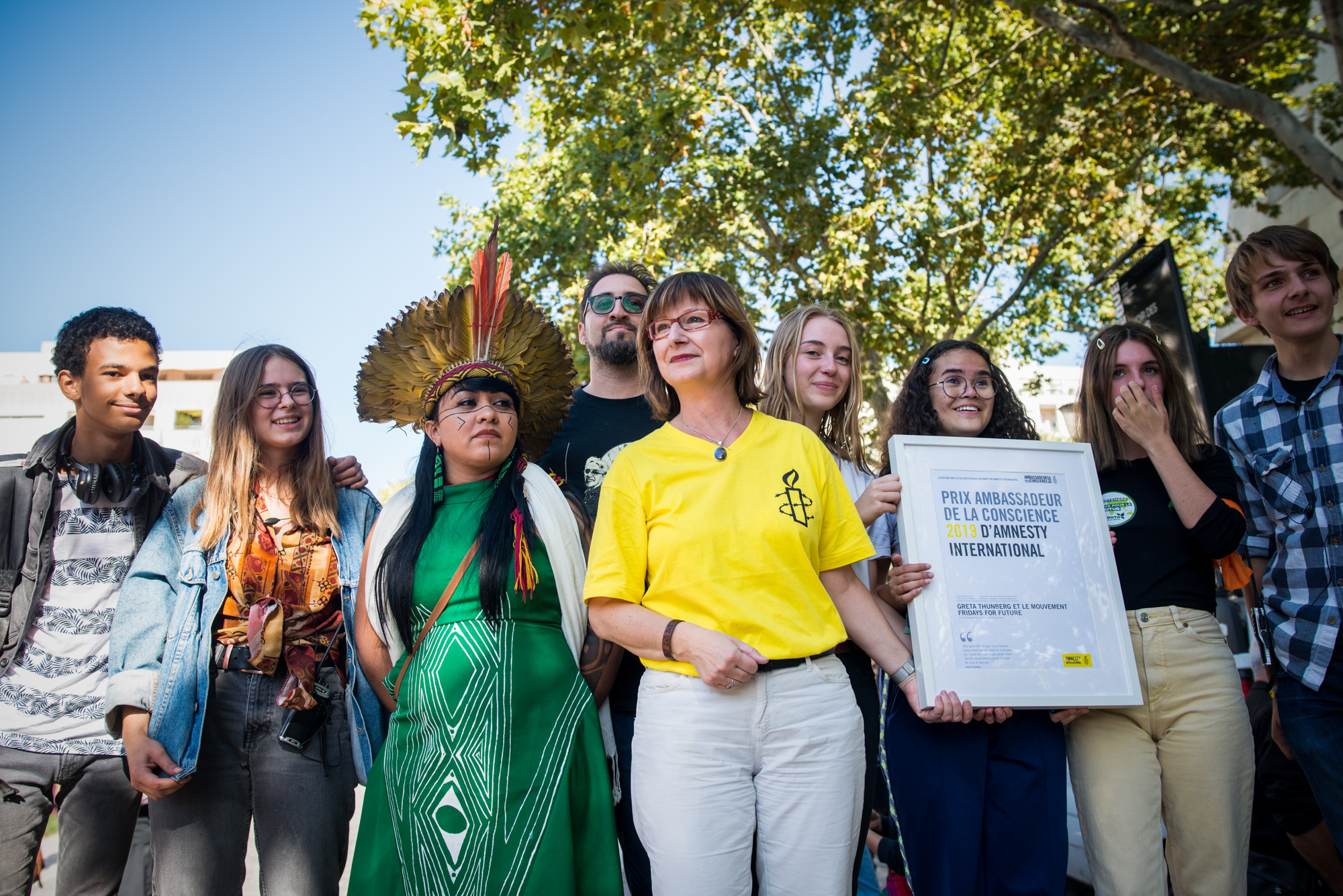 Cécile Coudriou, Présidente d’Amnesty International France, a remis vendredi 20 septembre le prix Ambassadeur de conscience 2019 aux jeunes militants pour le climat. Le prix Ambassadeur de conscience récompense des personnes qui ont assumé un rôle de chef de file et font preuve d’un courage exceptionnel dans la défense des droits humains. Il avait été remis à Greta Thunberg et au mouvement Fridays for Future le 16 septembre à New York.