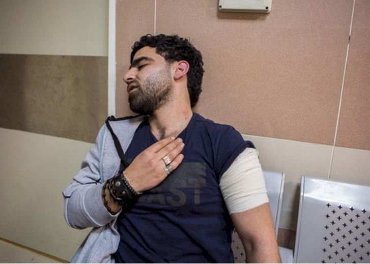 Un des manifestants qui a reçu des coups de bâton sur l’épaule et dans le dos attends à l’hôpital public de Ramallah pour recevoir des soins ©Amnesty International