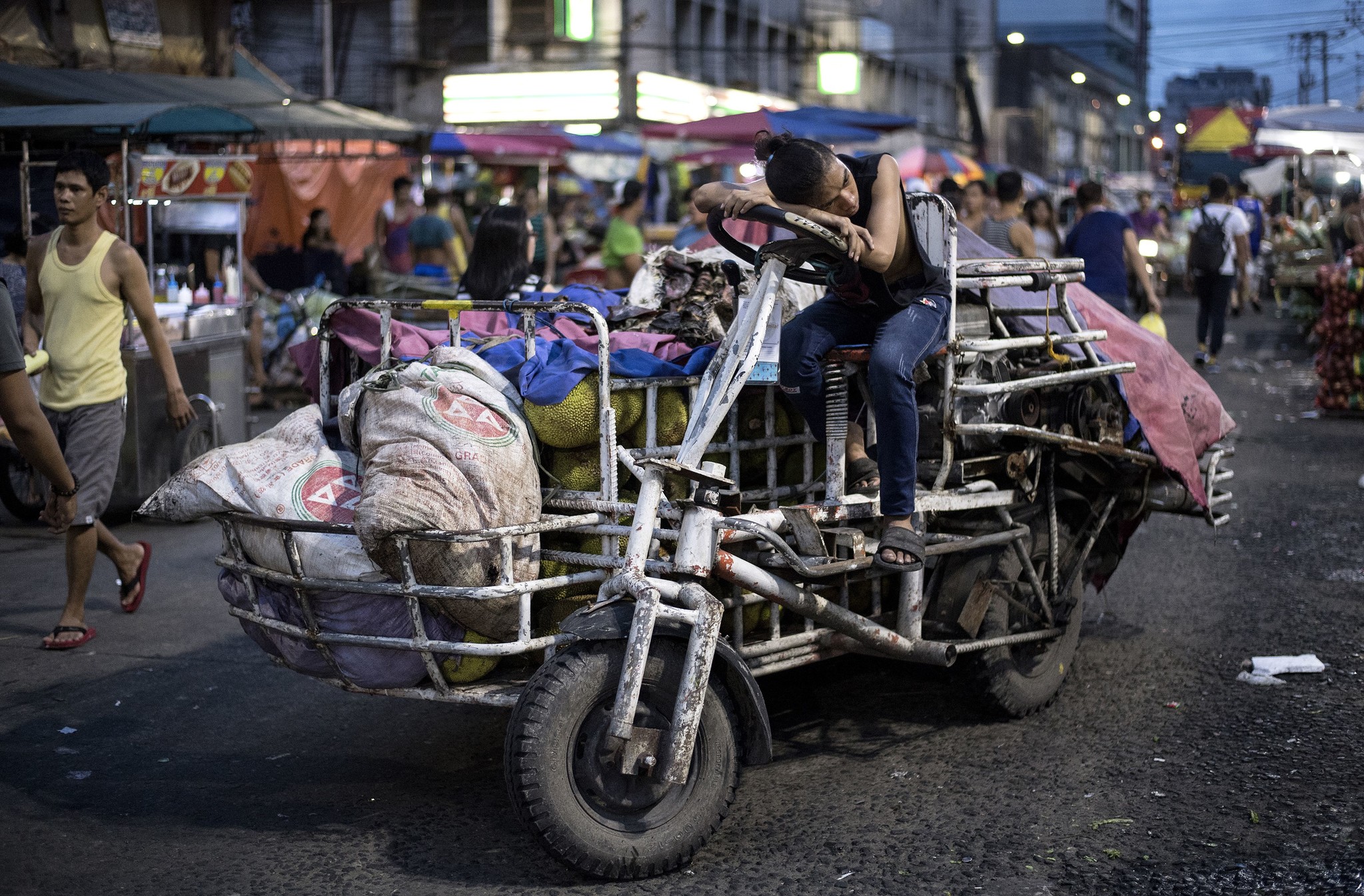 Une livreuse de légumes se repose sur son rickshaw à Manille, Philippines, juillet 2018. © AFP/Getty Images