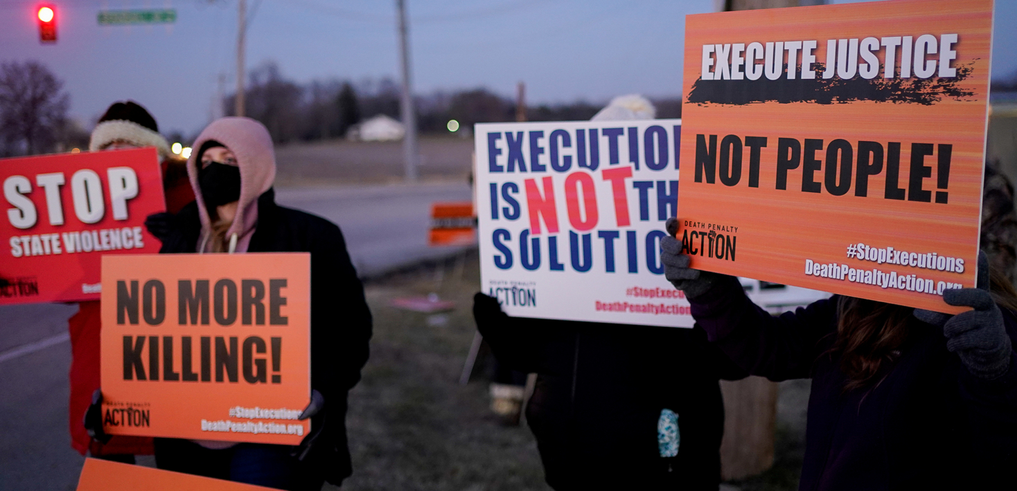 Un militant opposé à la peine de mort manifeste devant le pénitencier des États-Unis à Terre Haute, Indiana, 15 janvier 2021 © REUTERS/Bryan Woolston