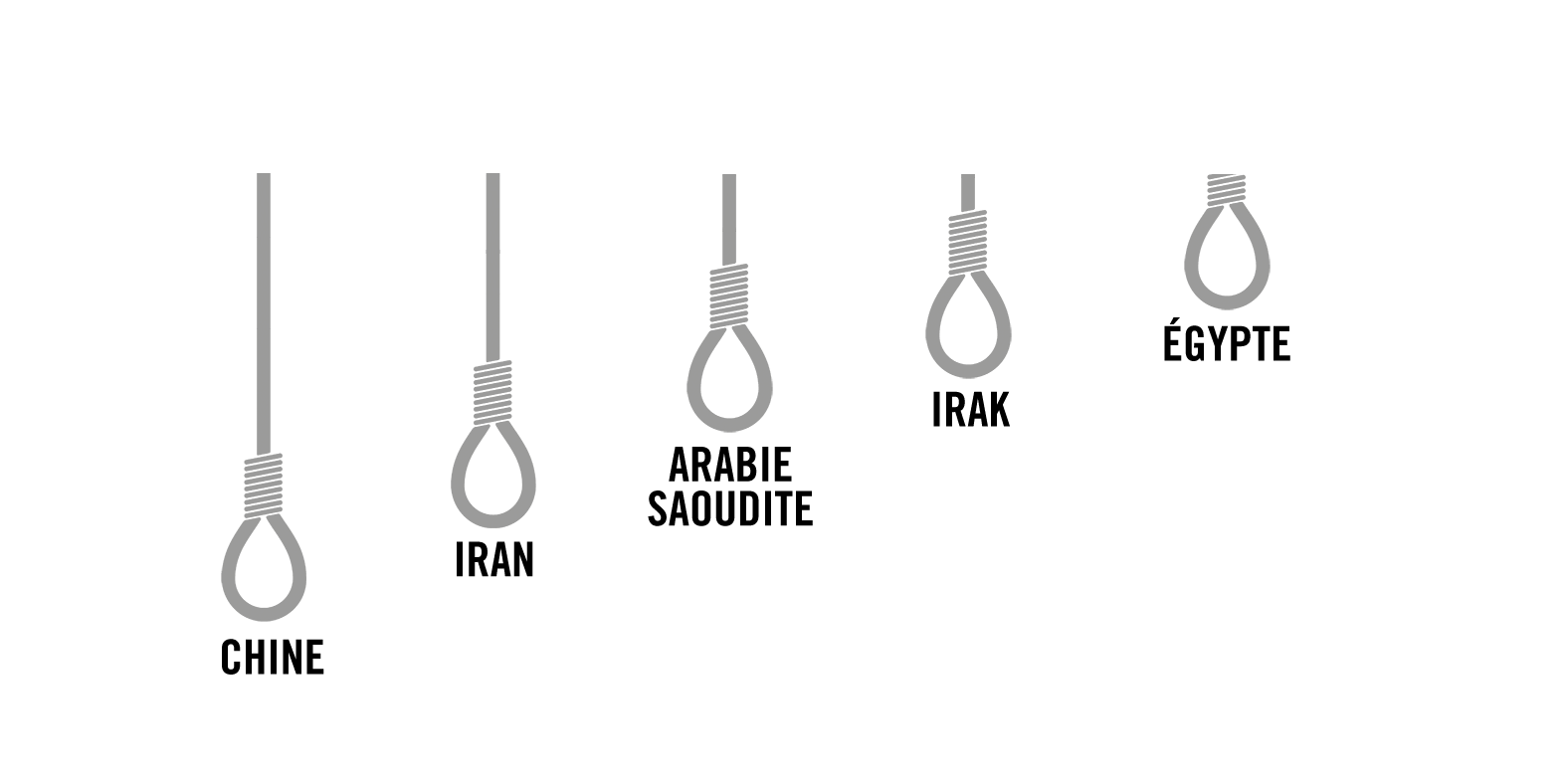 Malgré une baisse mondiale au niveau des exécutions, seuls vingt pays étaient responsables de toutes les exécutions recensées dans le monde en 2019. Parmi eux, cinq pays courent en tête : la Chine, l’Iran, L’Arabie saoudite, l’Irak, et l’Égypte.