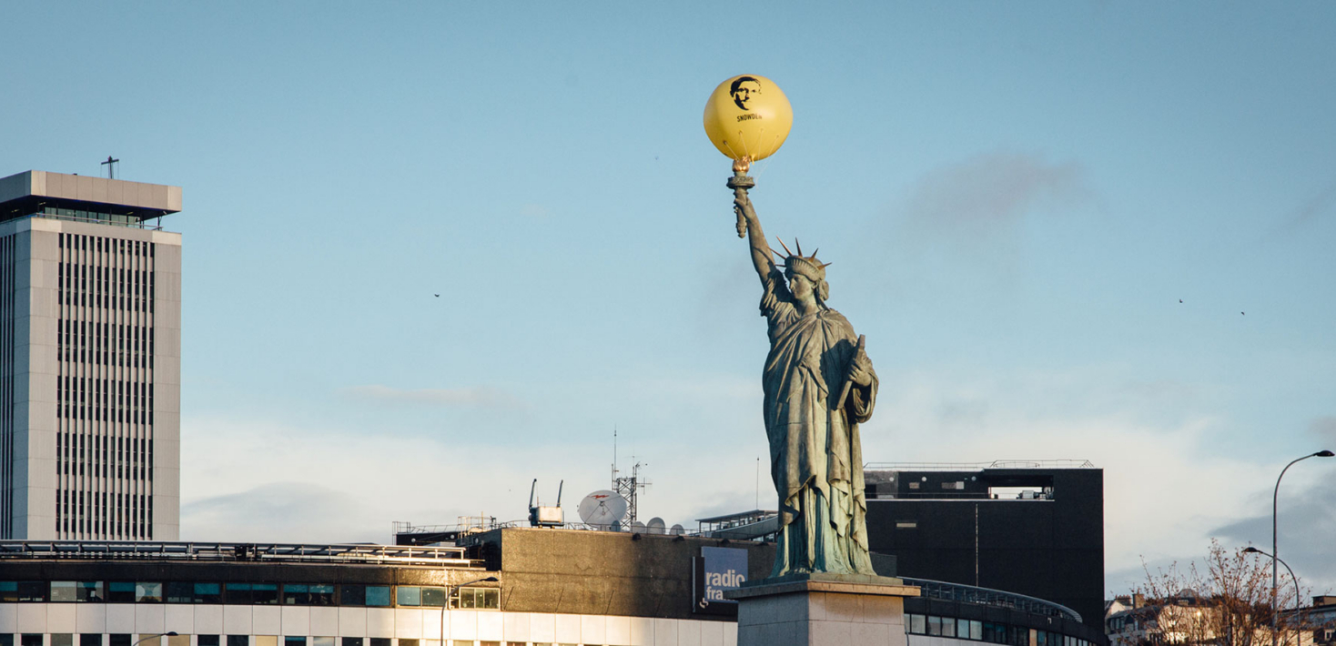 Au petit matin de ce 13 janvier, passants et touristes ont pu découvrir une Statue de la Liberté tenant à bout de bras un ballon de 2mètres50 qui arbore fièrement le visage de Snowden.