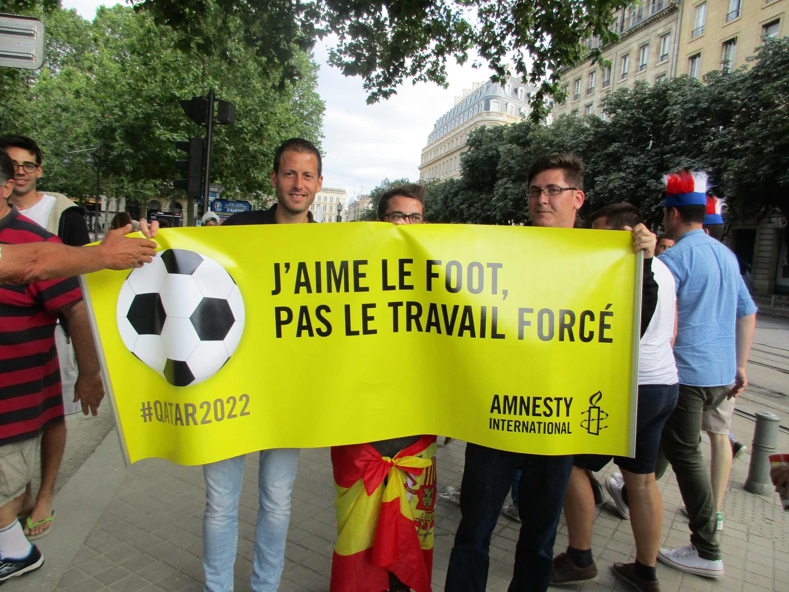 Pendant l’Euro, nos militants ont dit stop aux terribles violations des droits humains endurés par de nombreux travailleurs migrants œuvrant sur les sites de la Coupe du monde 2022 actuellement en construction au Qatar.