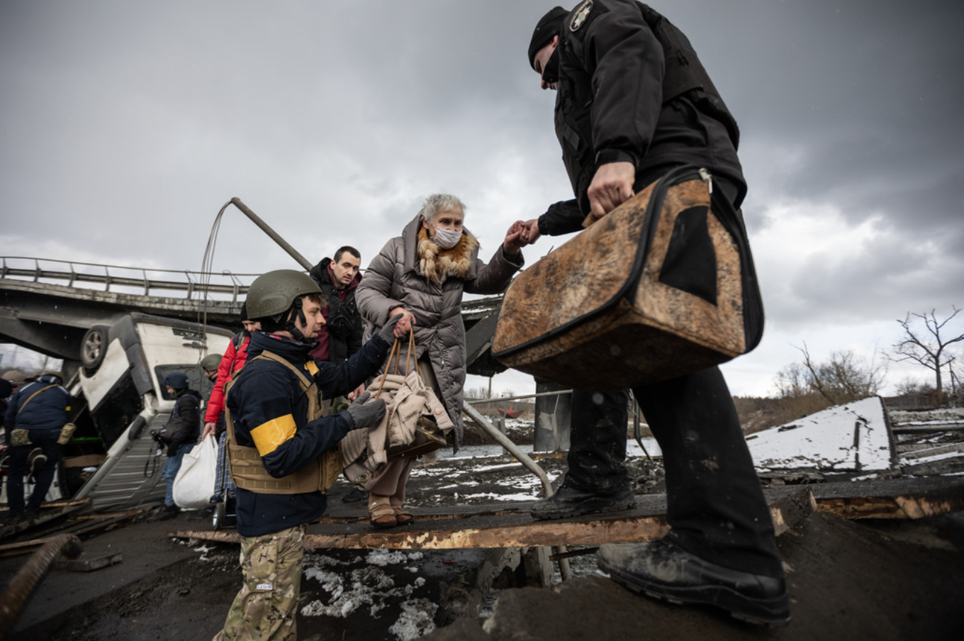 Des Ukrainiens traversent un chemin improvisé le long d’un pont détruit alors que les habitants continuent de fuir la ville le 8 mars 2022 à Irpin, en Ukraine.