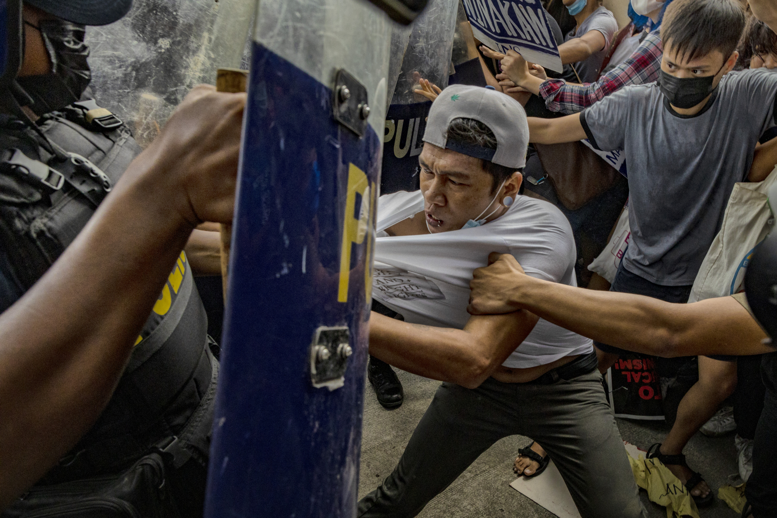Des militants se heurtent à des policiers lors d’une manifestation contre les résultats des élections au bureau de la Commission des droits de l’homme, le 25 mai 2022 à Quezon city, dans la région métropolitaine de Manille, aux Philippines.
