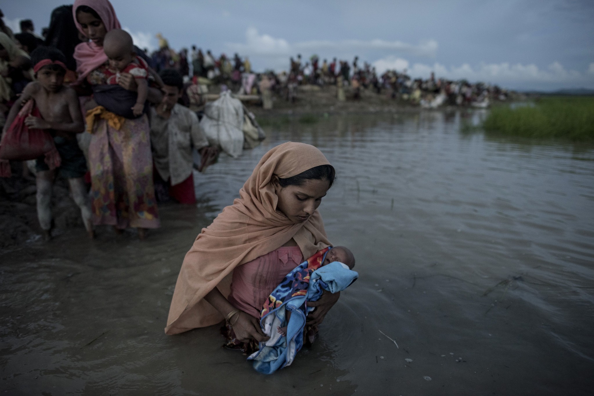 À Whaikhyang, des réfugiés rohingyas traversent la rivière Naf, qui marque la frontière entre le Myanmar et le Bangladesh (9 octobre 2017). © Fred Dufour/AFP/ Getty Images