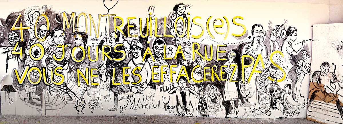 Expulsées, elles ont cherché un abri dans le parc des Beaumonts avant de retourner devant la mairie. Nouvelle expulsion et refuge provisoire sous la halle de la Croix de Chavaux (au marché). Retour place de la mairie puis expulsion vers le square Marcel-Cachin où les familles passent quelques nuits sous des tentes avant l’expulsion et le retour place Jean-Jaurès devant le théâtre de Montreuil, puis derrière, où les tentes sont moins visibles. Nouvelle expulsion et refuge de deux nuits à la halle Dufriche (un terrain vague privé) avant le retour place de la mairie. À chaque fois la même scène : ordre de partir tout de suite, menace des policiers de procéder à des contrôles d’identité pouvant conduire à des OQTF (Obligation à quitter le territoire français) tandis que les agents de la voirie jettent à la benne une partie des affaires, passent au jet d’eau l’espace occupé par les matelas, rassemblement rapide des objets récupérables entassés dans des remorques brinquebalantes tirées par des vélos, matelas empilés ou roulés, enfants embarqués au milieu des gros sacs sur des poussettes qui n’en peuvent plus, déplacement du campement un peu plus loin dans la ville pour une réinstallation provisoire.
