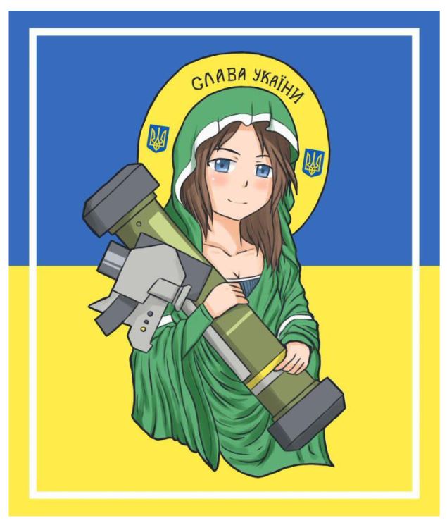 Dessin du compte whatsapp de Varvana représentant une fille tenant une arme antichar, le Javelin, avec le slogan ukrainien signifiant « Gloire à l’Ukraine »