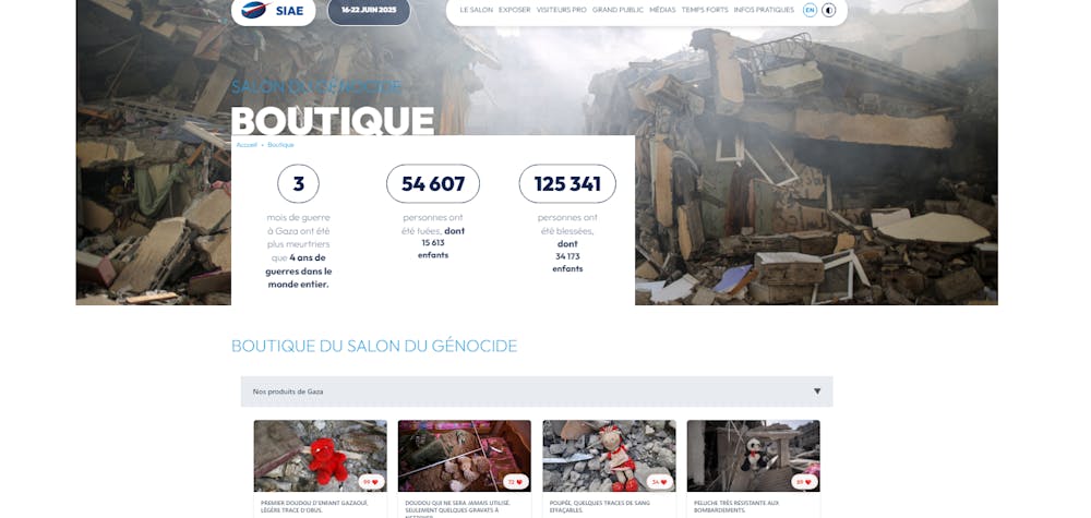 Page d'accueil de notre site « Le Salon du Génocide », pastichant celui du salon de l’armement, juin 2025.