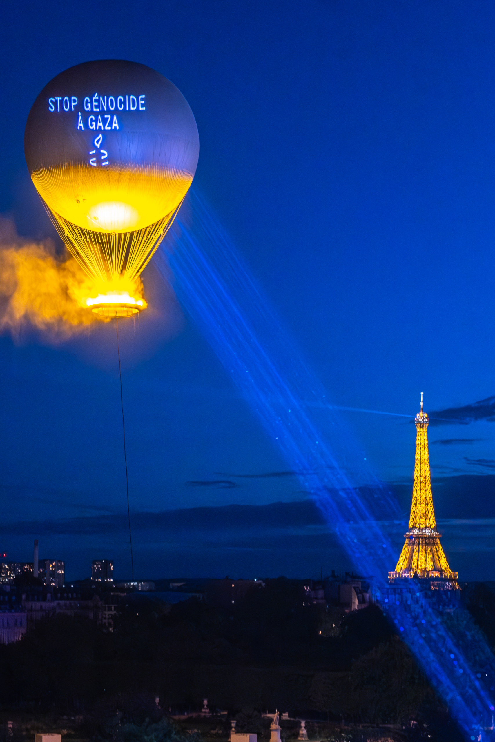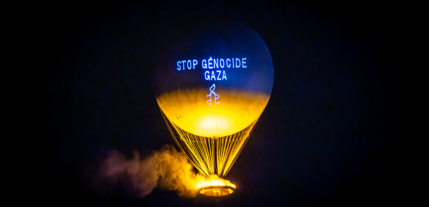Amnesty International France a projeté un message géant dans le ciel de Paris, sur la vasque olympique, pour dénoncer le génocide en cours à Gaza et rappeler le sort tragique de la population palestinienne dans l’enclave.