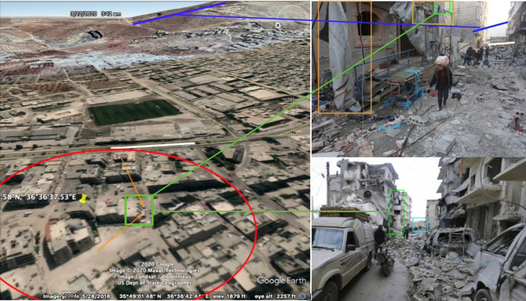Géolocalisation de vidéos montrant la situation après la frappe du 29 janvier 2020 contre l’hôpital al Shami, à Ariha