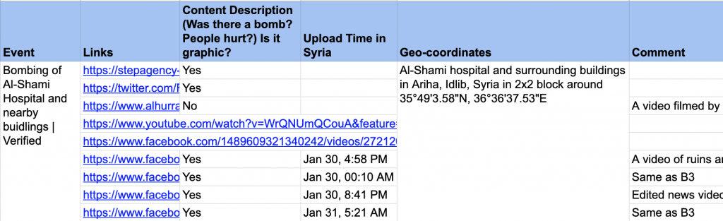 Première étape, nous avons sollicité le Service de vérification numérique, notre réseau mondial, composé d’étudiants bénévoles formés aux techniques de vérification numérique. Nous avons alors reçu l’aide d’un groupe de cinq bénévoles expérimentés de l’une de nos organisations partenaires – le Centre des droits de l’homme de l’Université de Californie, Berkeley. L’équipe de Berkeley a pris la liste des écoles et des hôpitaux qui, selon les personnes interrogées, avaient été attaqués à telle date, et a effectué des recherches en ligne afin de trouver des contenus semblant correspondre à cette attaque. Elle a vérifié la provenance de vidéos et de photos publiées sur Internet – notamment sur Facebook et Twitter.