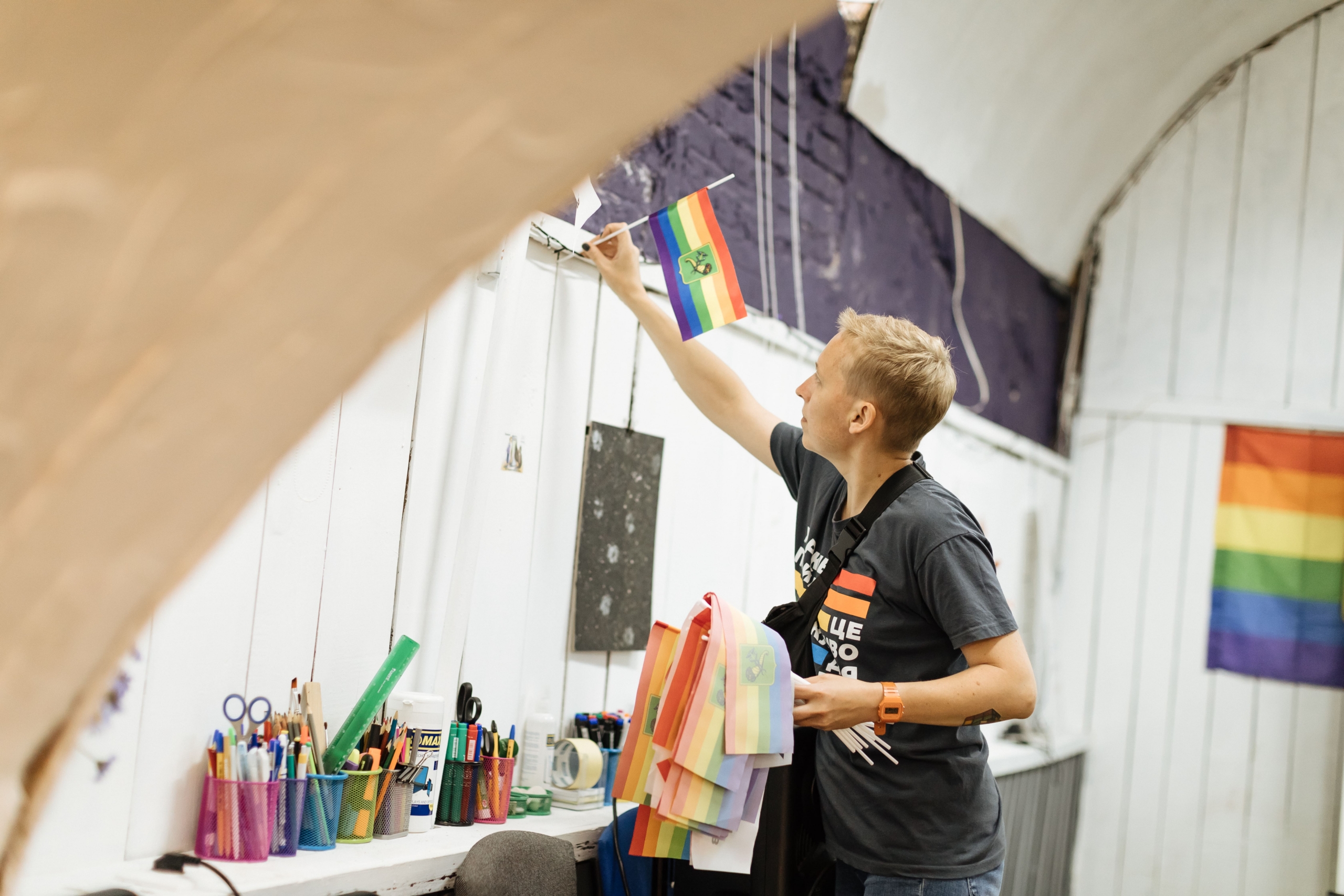 Vira, co-fondatrice de l’ONG Sphere, décore les locaux de l’association © Kate Mamaisur/Amnesty International