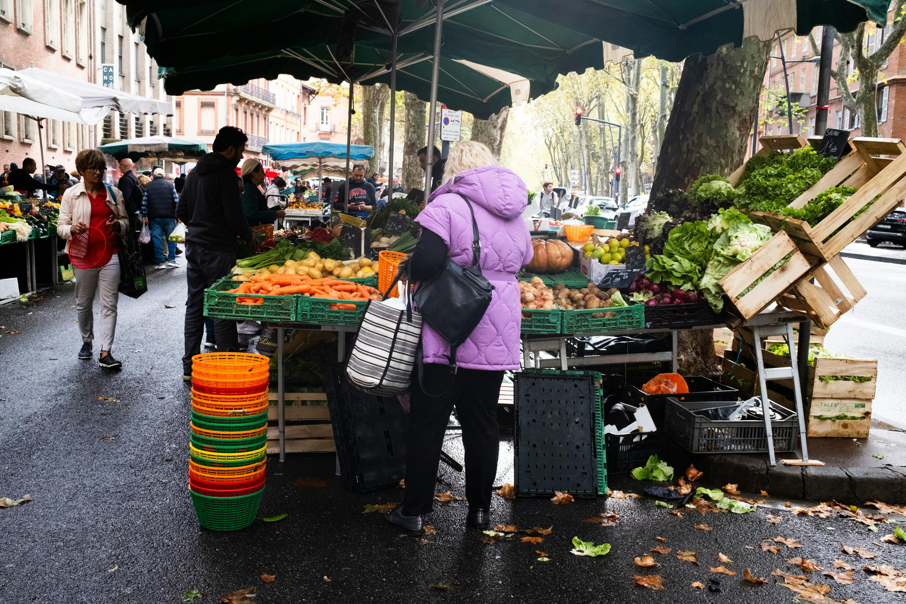 Chaque semaine, Célia tient à nourrir convenablement ses deux enfants, l’un âgé de 6 ans et l’autre âgé de 4 et demi en situation de handicap, en leur achetant des légumes et des fruits frais sur un marché de Toulouse aux prix abordables, 22 Octobre 2025 © Camille Millerand pour Amnesty International France