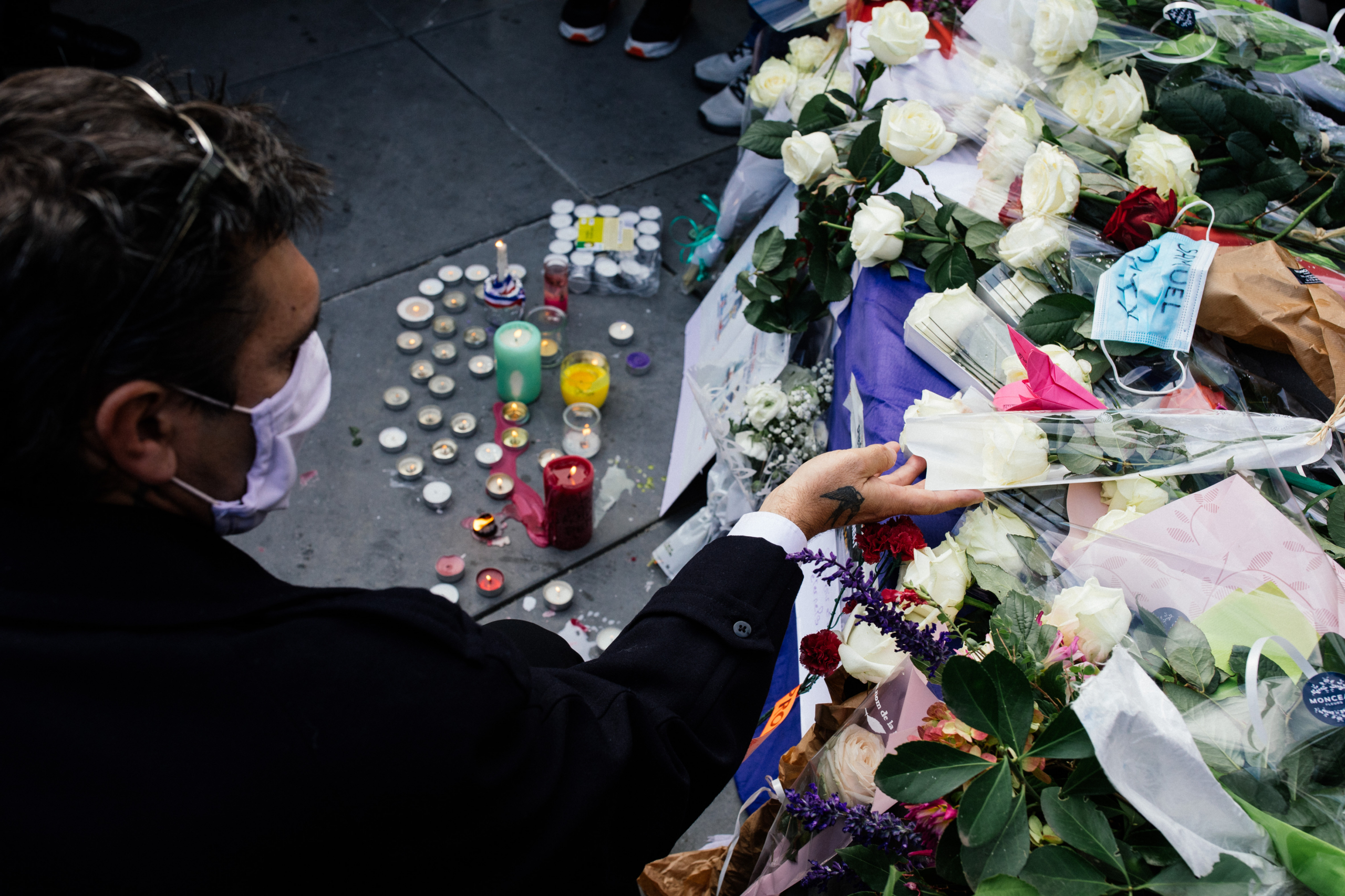 Des milliers de personnes se sont rassemblées place de la République pour rendre hommage a Samuel Paty, le professeur d’histoire-geographie assassiné dans les Yvelines. Paris, 18 octobre 2020. © Marie Magnin / Hans Lucas via AFP