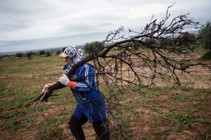 Une femme transporte du bois sec pour préparer un feu. Région du Sidi Bouzid. Novembre 2018 © Augustin Le Gall / Haythan-REA