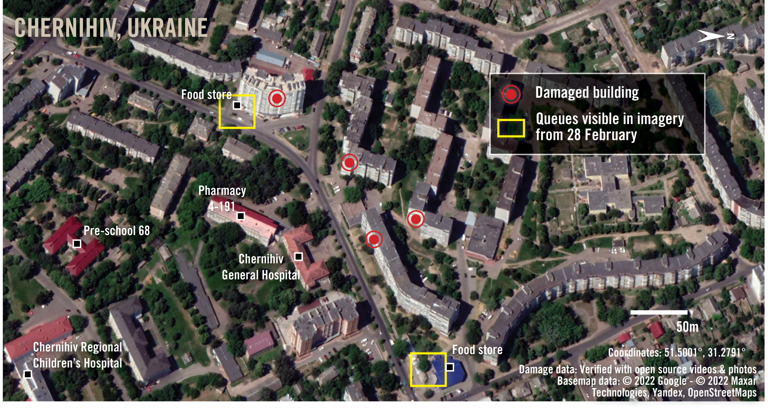 Une carte générale montrant les zones de dommages – vérifiées à l’aide de photos et de vidéos disponibles en open source – des frappes du 3 mars 2022 à Chernihiv, en Ukraine. D’importantes infrastructures civiles sont également représentées à proximité immédiate des zones de dommages vérifiées. Des files d’attente ont été observées dans deux magasins d’alimentation de la région immédiate sur des images satellite du 28 février (non montrées).