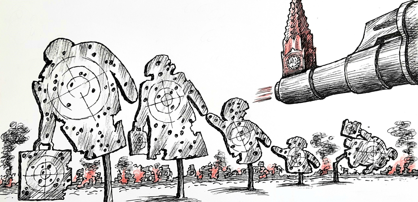 V.K – C’est très intéressant d’utiliser l’humour pour critiquer cette guerre. Les hyperboles et les exagérations dans les dessins font forcément sourire. Et c’est important que celles et ceux qui arrivent à créer ces émotions s’en servent pour dénoncer la guerre. Du fait de ma proximité avec le sujet, je n’y arrive pas. Mais selon moi, un bon dessin de presse doit faire rire, réfléchir et pleurer.