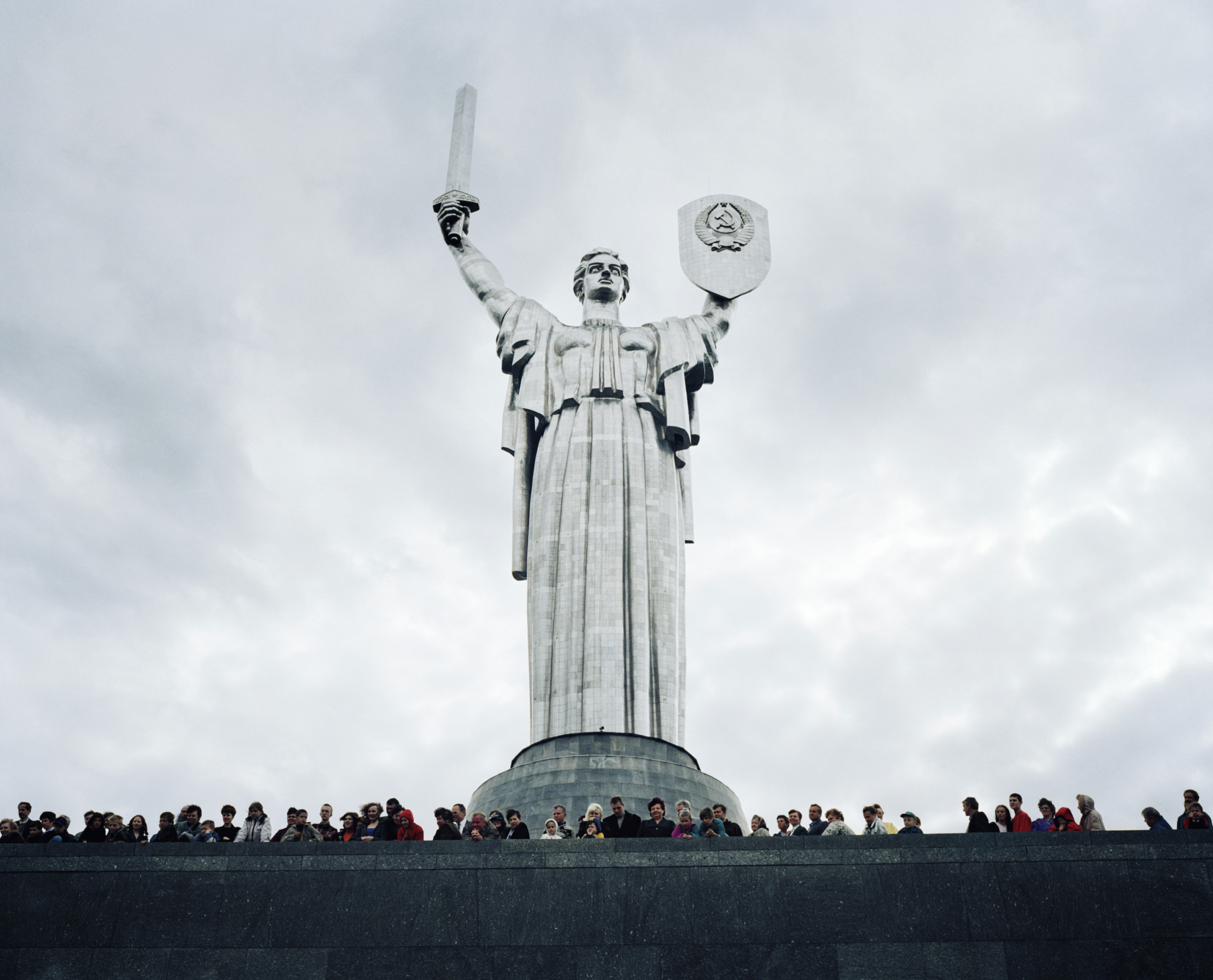 « Cette photo a été prise le 9 mai 2001, lors de mon premier voyage en Ukraine. Je revenais juste de Tchernobyl et c’était le jour de la célébration de la fin de la Grande Guerre – la seconde guerre mondiale. Cette statue représente la Mère-patrie ukrainienne. Dans ses mains, elle porte le glaive d’un côté et l’emblème du régime communiste, la faucille et le marteau, de l’autre. C’est un symbole de l’empire soviétique qui mesure 102 mètres de hauteur. À l’époque, ils avaient fait en sorte que la statue soit plus haute que tous les bâtiments religieux alentours. On trouve même un musée à l’intérieur. En 2001, avec l’influence russe en toile de fond, il n’y avait pas de remise en cause de ces choses-là. Aujourd’hui, il y a un débat pour savoir s’il faut la démembrer.