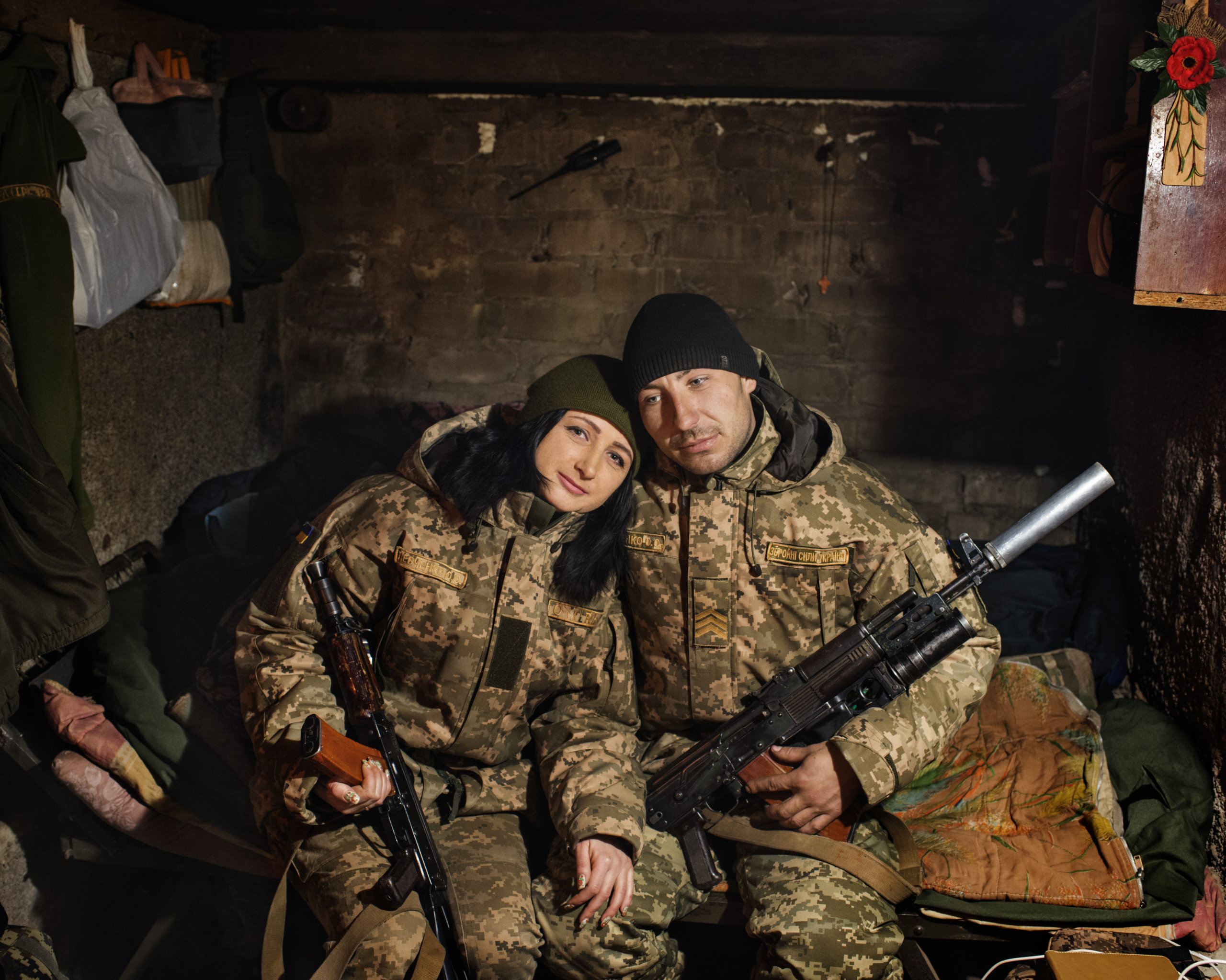 La guerre du Donbass qui a éclaté en 2014, s’est enlisée. Sur la ligne de front, des couples se sont formés. Ce couple, en photo, tenait la dernière position avant les séparatistes. Ils avaient fait leur petite chambre dans un bunker. Je crois que l’armée ukrainienne est une des seules armées au monde où il y a des rapprochements de couples sur la ligne de front. C’est assez unique !