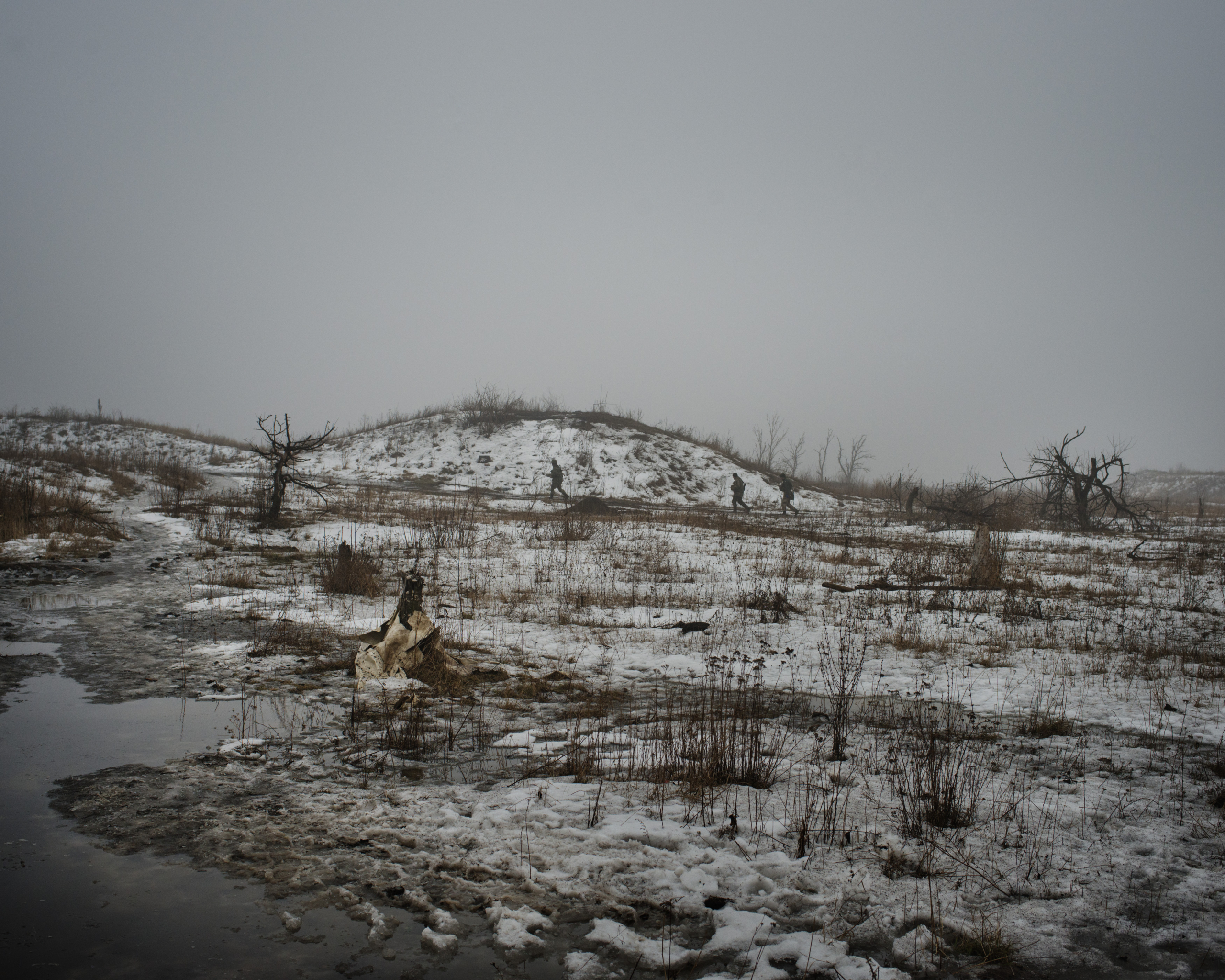 Sur cette photo on ne voit rien. On voit simplement des petits bonhommes qui marchent dans la neige. C’était pourtant une des zones les plus dangereuses à l’époque. Ce jour-là, il y avait de la brume et on pouvait être en semi-sécurité. Je pensais alors que cette guerre allait durer trente ans et qu’elle allait rester oubliée jusqu’à ce qu’un jour, elle rééclate. Même à Kiev, des gens semblaient oublier qu’il y avait une guerre dans le Donbass…