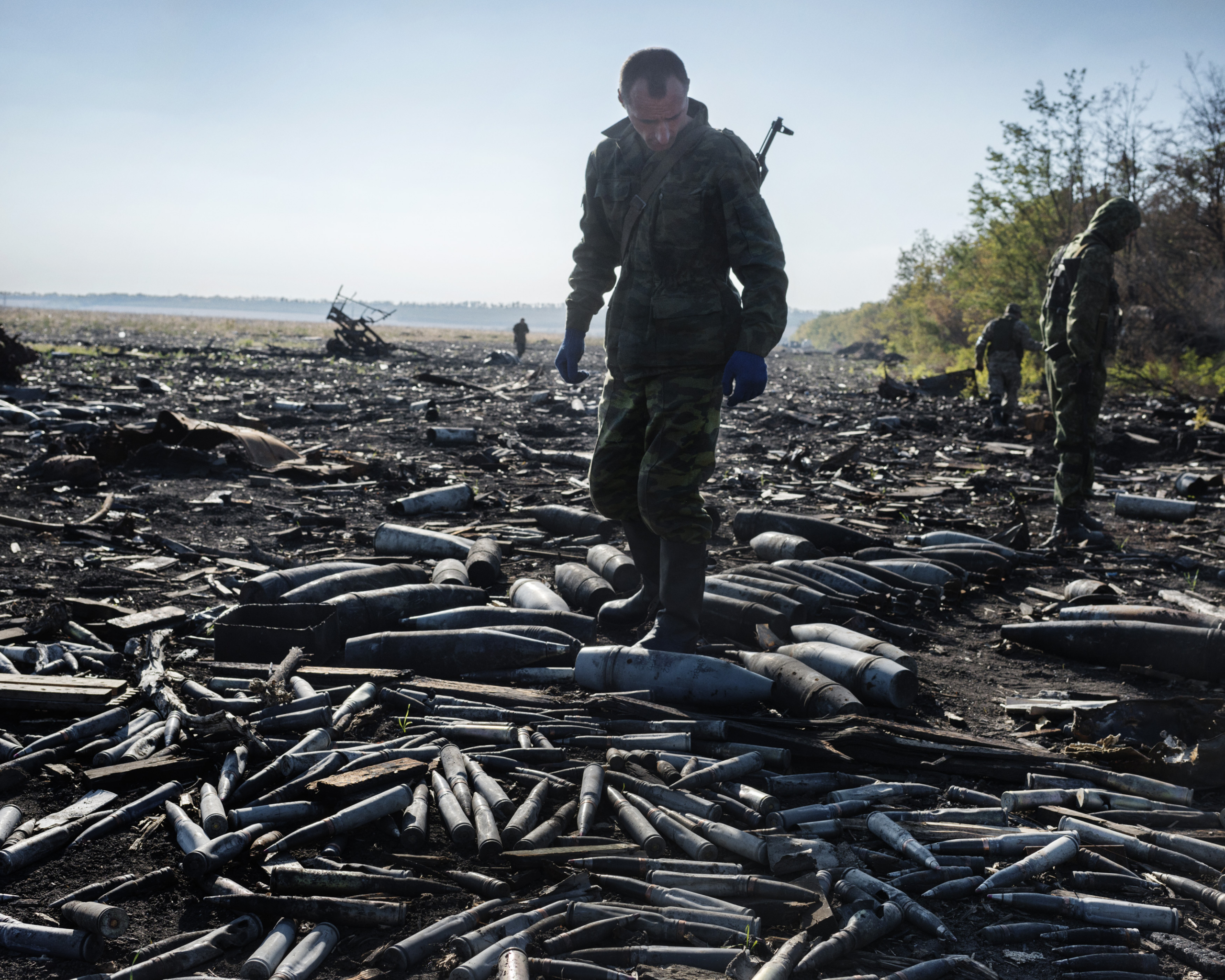 Certaines personnes ont l’impression que la guerre est arrivée d’un coup, avec l’invasion des russes en février dernier. Pourtant en janvier, j’étais encore sur les lignes de front en Ukraine, et elle était bien là, la guerre. Sur cette photo, on est dans l’imagerie de la guerre de 1914 avec ses champs de bataille et ses munitions à perte de vue. On voit des séparatistes après un combat dans le Donbass, faire le tri des armes et voir lesquelles pouvaient être réutilisées.