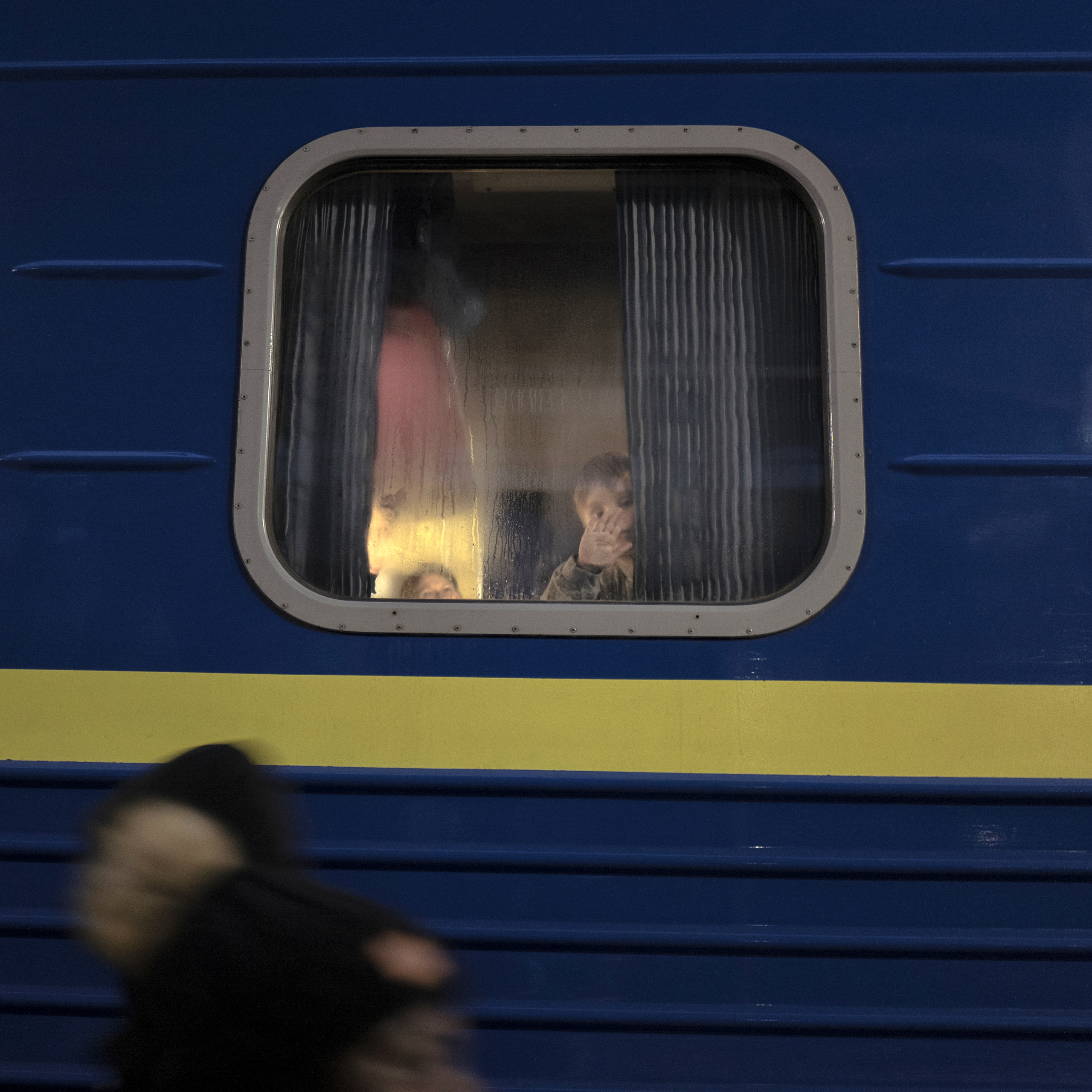 Le 26 février 2022, gare centrale de Kyiv (nord de l’Ukraine). Deux jours après le début de l’invasion russe, des milliers d’Ukrainiens cherchent à fuir la capitale. Parmi eux, Théo, 5 ans, accompagné de sa grand-mère. Il dit au revoir à son père, alors que le train est sur le point de partir vers l’ouest de l’Ukraine.