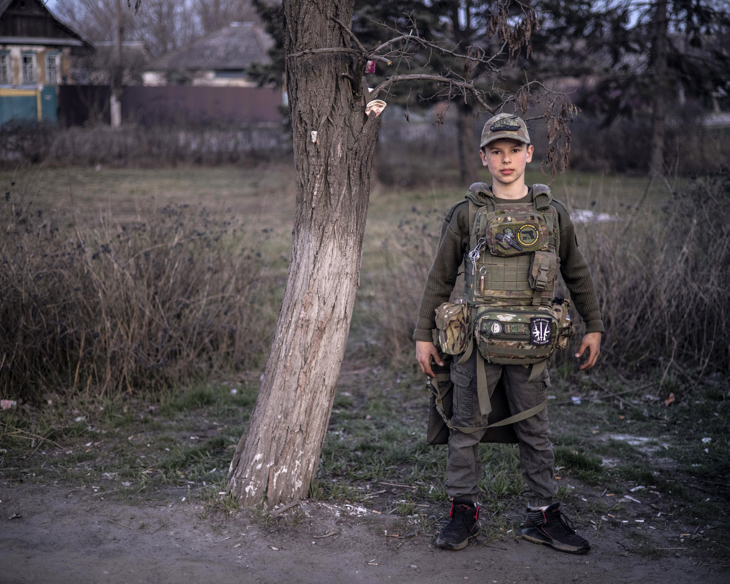 Le 28 mars 2024, à Lyman (région du Donbass, est de l’Ukraine). Un jeune garçon, qui a revêtu la tenue d’un soldat ukrainien, pose après une distribution alimentaire organisée par des volontaires. Le front se situe à une dizaine de kilomètres.