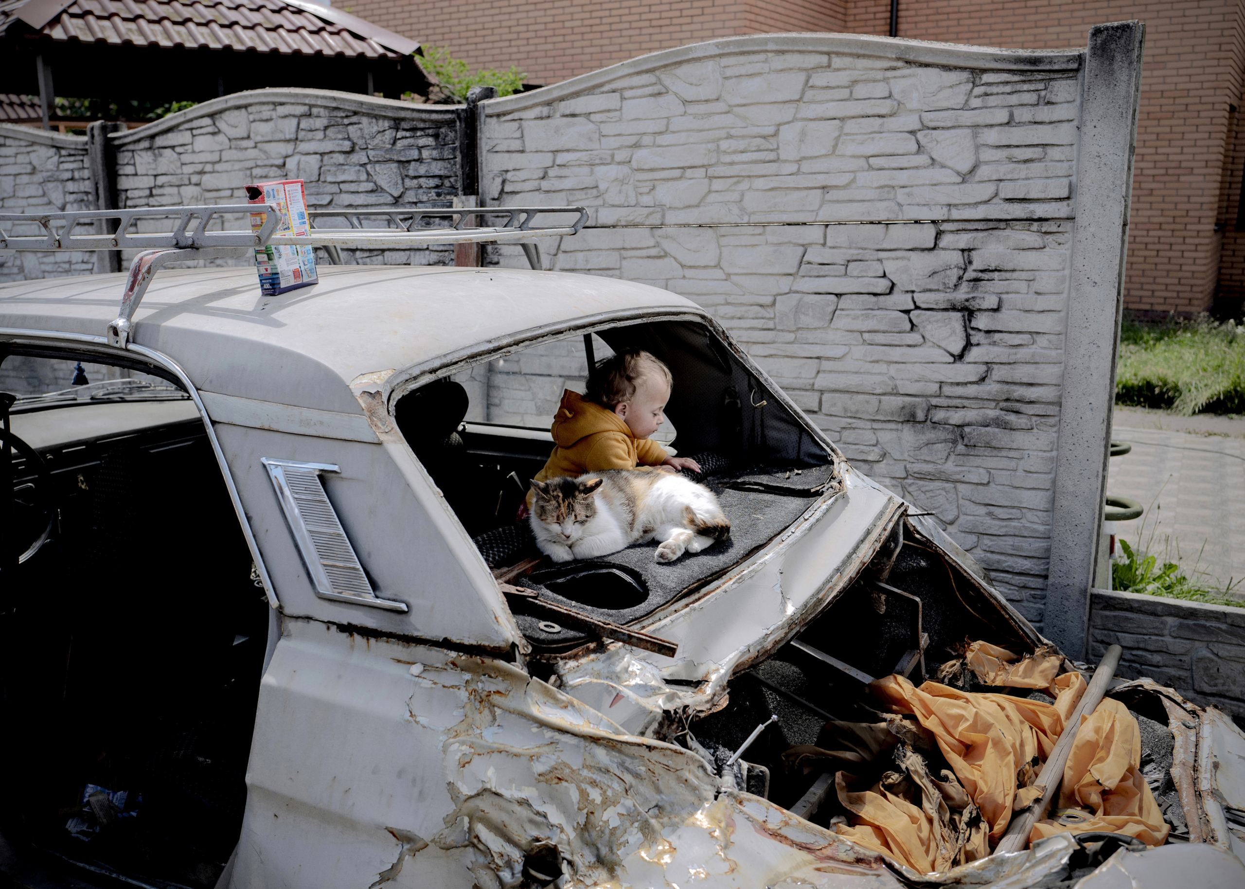 Le 22 juin 2022, à Boutcha (25 km au nord-ouest de Kyiv). Deux mois après le retrait de l’armée russe de cette petite ville, Alexandra, 18 mois, joue dans la voiture de son grand-père. C’est l’un des rares vestiges que sa famille a réussi à récupérer après le bombardement de leur maison pendant l’occupation russe en mars 2022.