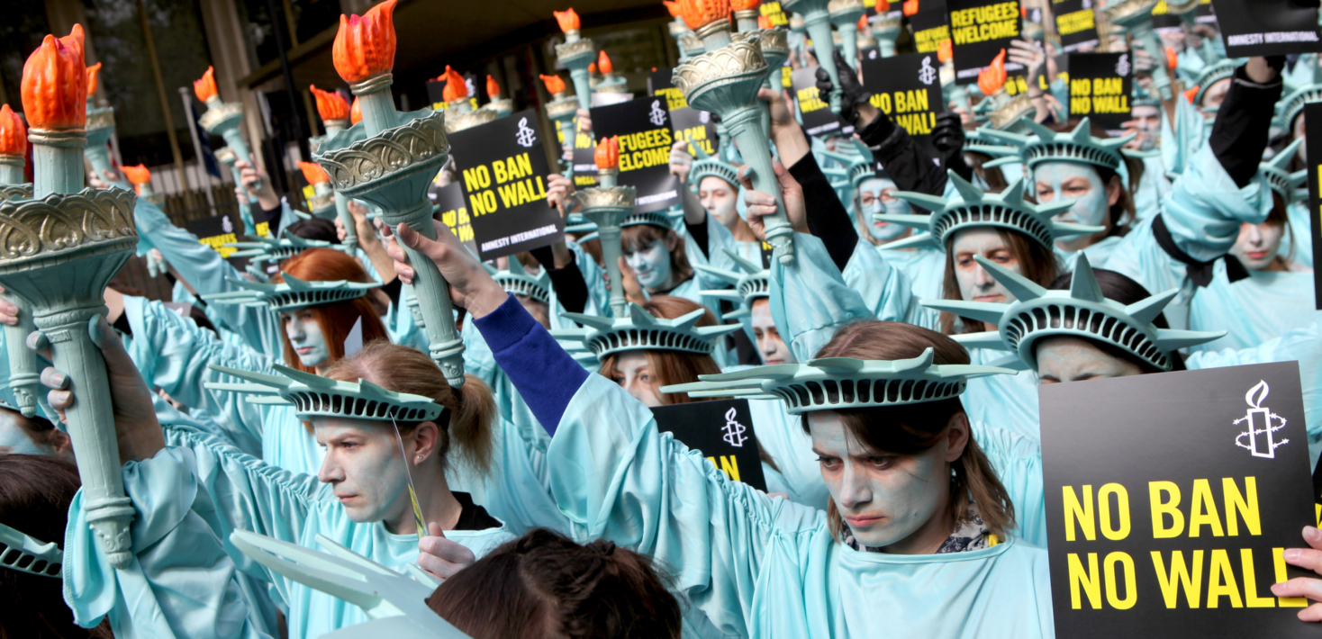 Nous avons placé des paillassons souhaitant la bienvenue aux réfugiés en bas de la Trump Tower et rempli Grosvenor Square à Londres de 100 Statues de la Liberté à la mine triste manifestant de manière silencieuse devant l’ambassade des États-Unis.
