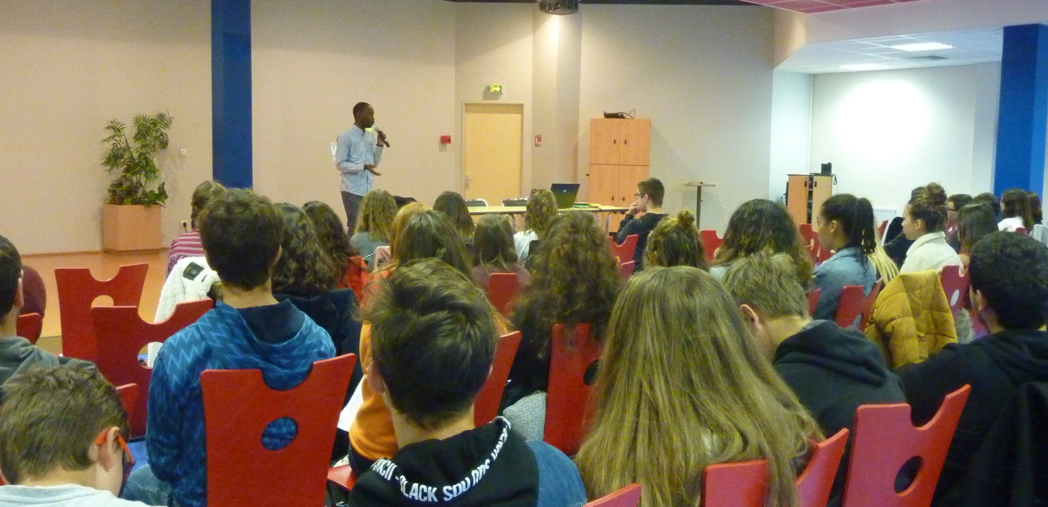 Après sa journée marathon à Thiers, Yves entame donc une nouvelle journée dense en témoignage. Devant des lycéens ultra attentifs, il raconte son engagement au sein de la Lucha, un mouvement citoyen congolais non-violent, son arrestation pour avoir simplement manifesté, sa longue détention arbitraire.