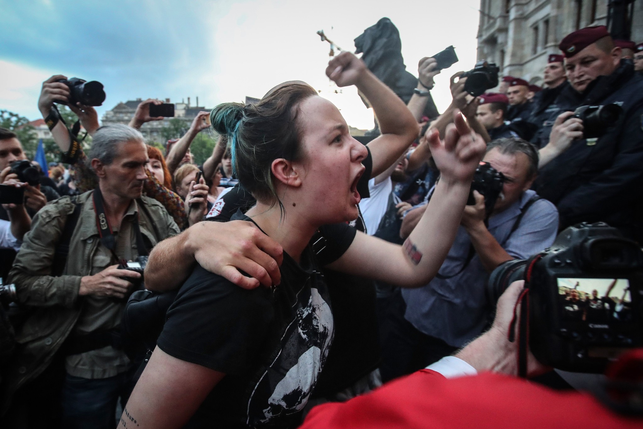 Une manifestante crie devant une unité de police lors d’une manifestation devant le bâtiment du Parlement à Budapest, en Hongrie, le 8 mai 2018 © AFP/Getty Images